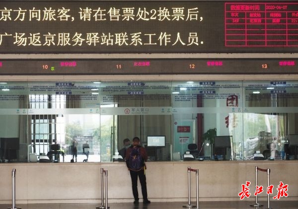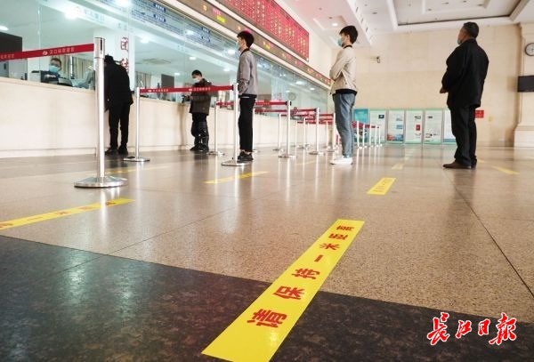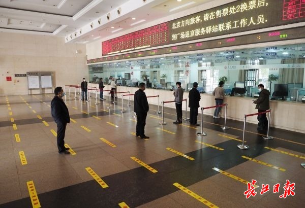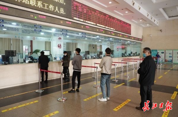 长江日报-长江网4月7日讯 7日,长江日报-长江网记者在汉口火车站售票大厅看到,不少旅客前来购买4月8日的火车票。汉口站在每个窗口前间隔一米设置多层一米等候隔离线,既保障了旅客有序购票,又减少了飞沫传播,让旅客更加安全。(记者詹松 摄影报道)