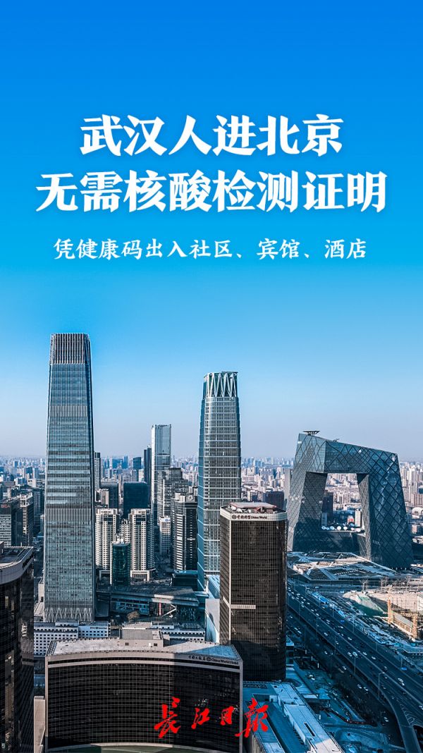 长江日报-长江网记者获悉:北京在继续抓好各项防控措施不放松的前提下,正有序恢复生产生活秩序,精准做好进(返)京人员健康管理服务。北京市已于2020年7月10日调整武汉进京人员相关防控政策:武汉进京人员入住北京市社区、村和宾馆酒店,无需提供核酸检测阴性证明。该政策已通知全市社区、村和宾馆酒店。