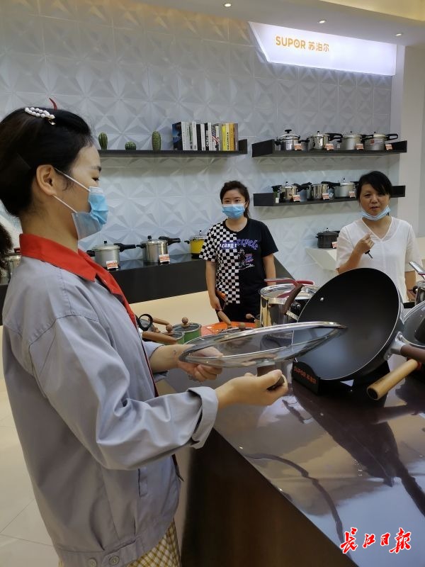 记者在公司产品展示区看到,不少客户都赶来了解芯铁II真不锈炒锅这款“爆款”新品。与其他类似的炒锅不同的是,这款炒锅手感不沉。“我们在工艺上进行了大胆创新。”公司办公室主任尹思告诉记者,这款“爆款锅”锅体以铁—铝—铁三层芯铁技术生产,“减少了锅的重量,同时传热更均匀,炒菜不会糊。”再加上可视钢化玻璃盖、斗拱构造的手柄连接设计等多项创新,售价虽然不菲,但很受欢迎。“7月1日才上架销售,这样的销量也出乎我们的意料。”
