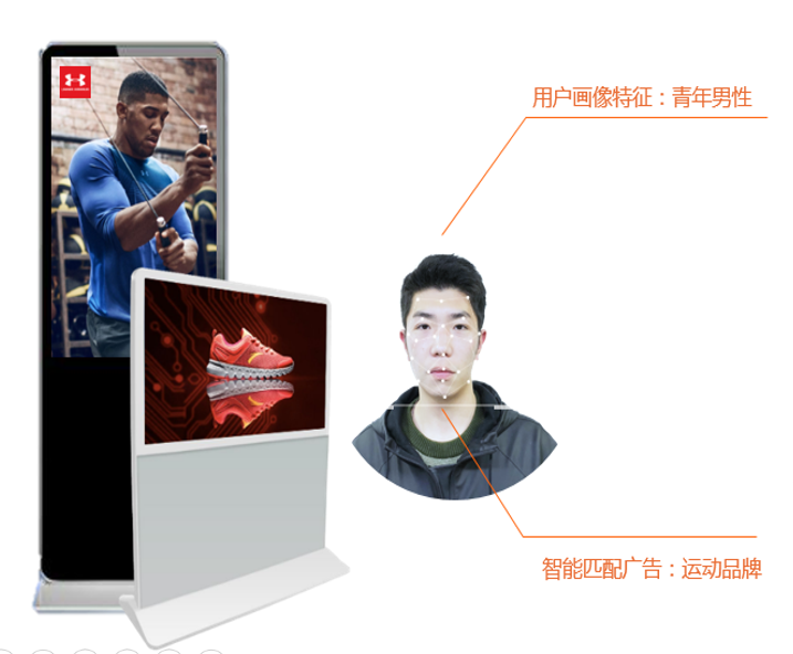 5、智能眼控广告机:同时街区内还配备了智能眼控广告机能够对观看者进行用户画像分析,识别性别和年龄等特性,推荐适合的广告进行播放,同时测算广告的关注程度。
