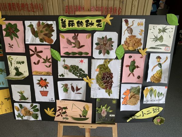 东亭幼儿园孩子们制作的叶贴画。图片由幼儿园提供