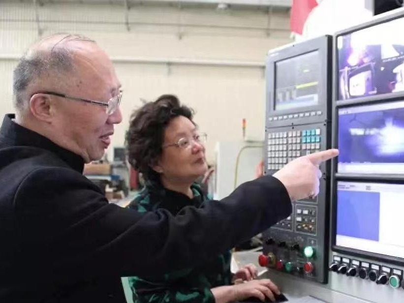 张海鸥(左)在3D打印数控机床操作台前指导技术人员。