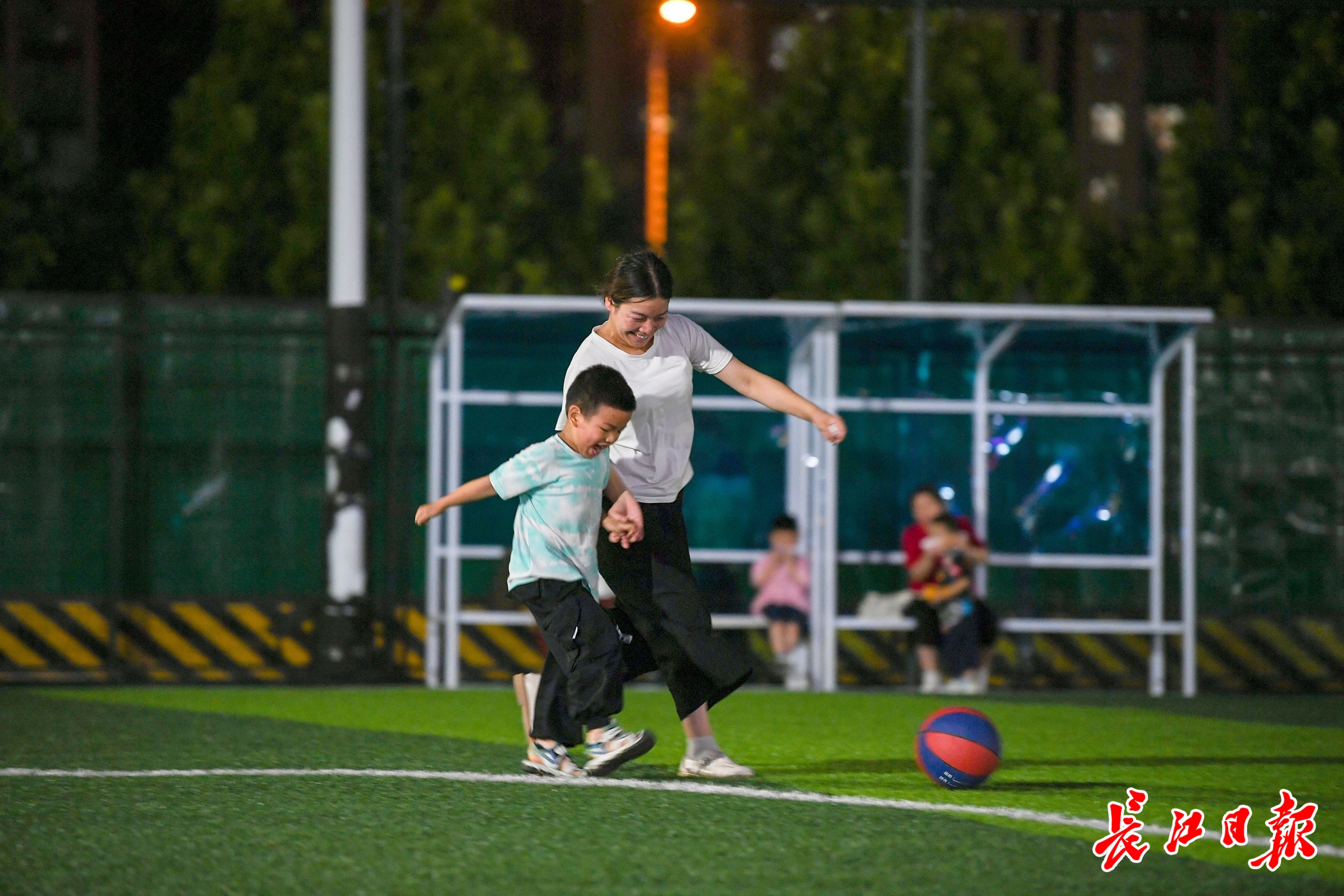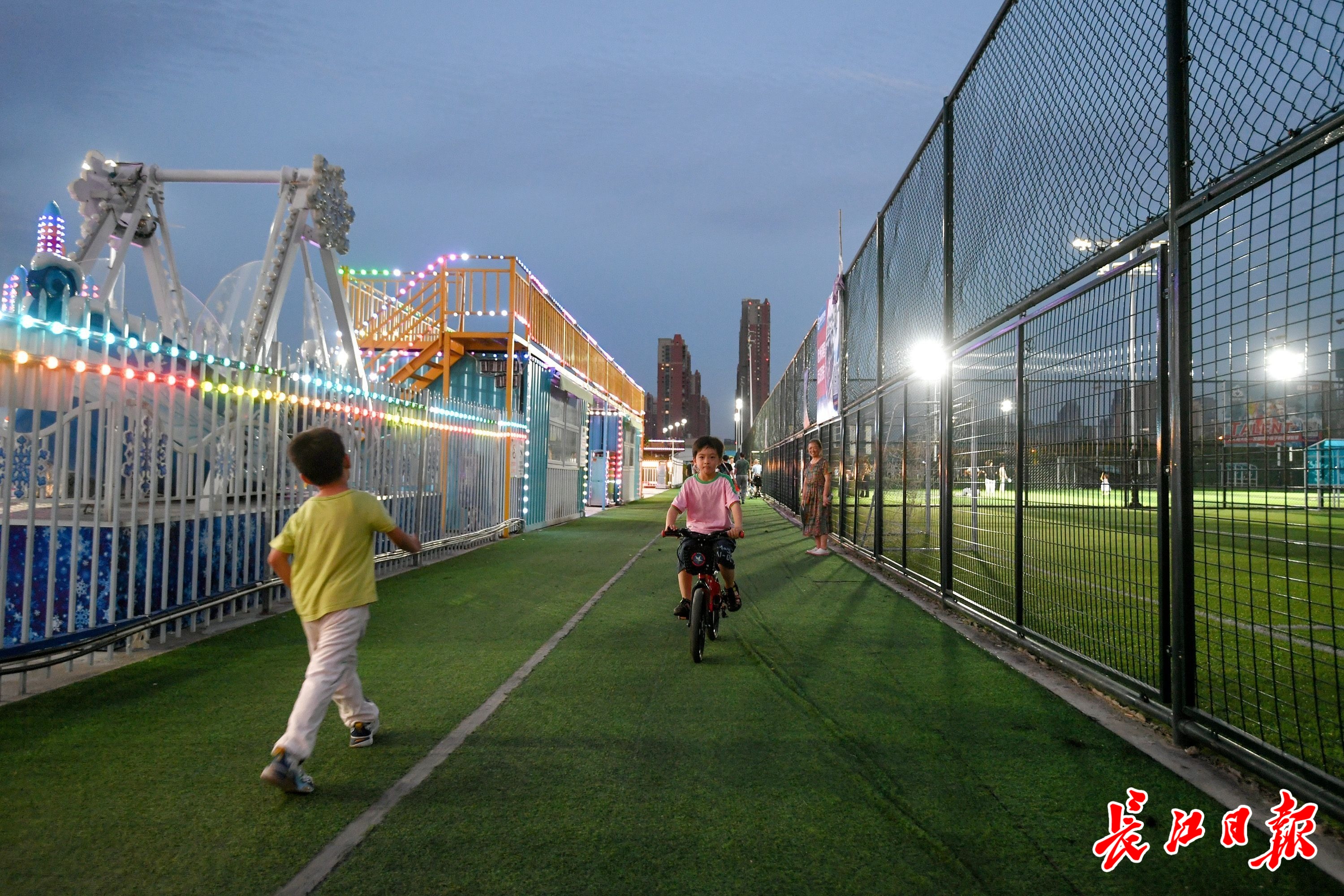 夜幕降临,居住在附近的居民来到四新体育公园内游玩。 记者史伟 摄