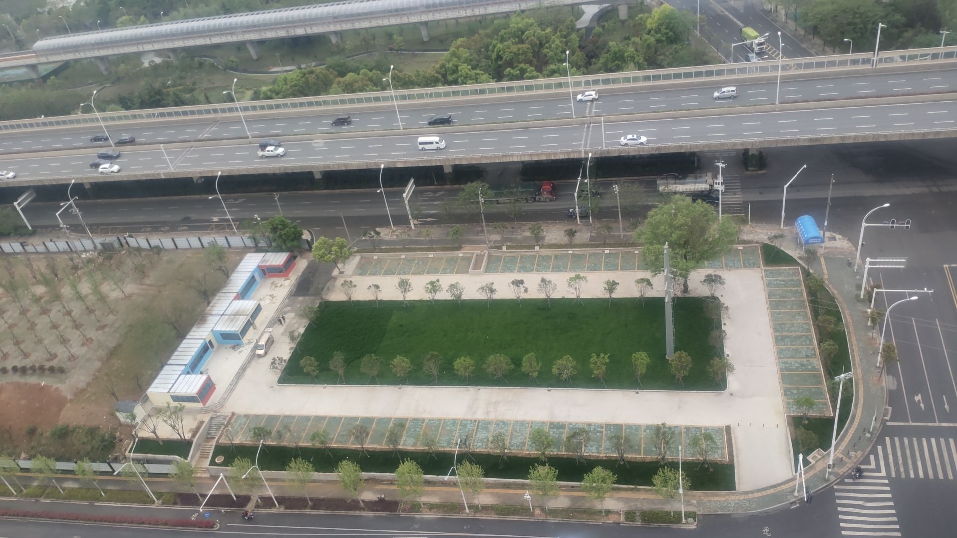 临空俯瞰,一方新绿镶嵌于城市道路拐角,曾经圈地种菜、杂草丛生的风景不见踪影。武汉市洪山区白沙洲大道和园艺二路交叉处,一处城市“边角地”被改造成了集交通、绿地及基础服务于一体的生态新能源停车场,即将对外开放。