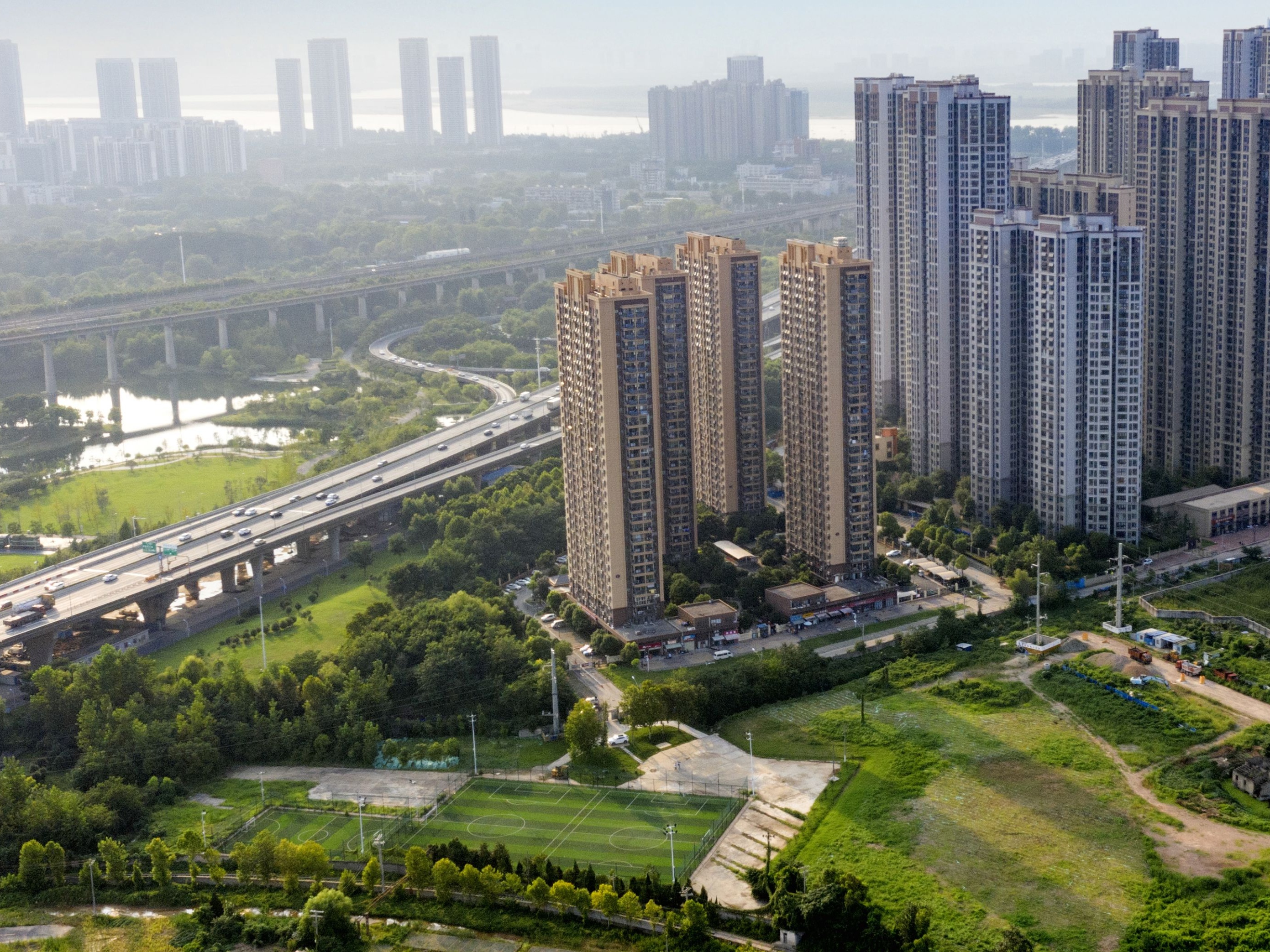 居民在四新体育公园内踢球。 记者史伟 摄