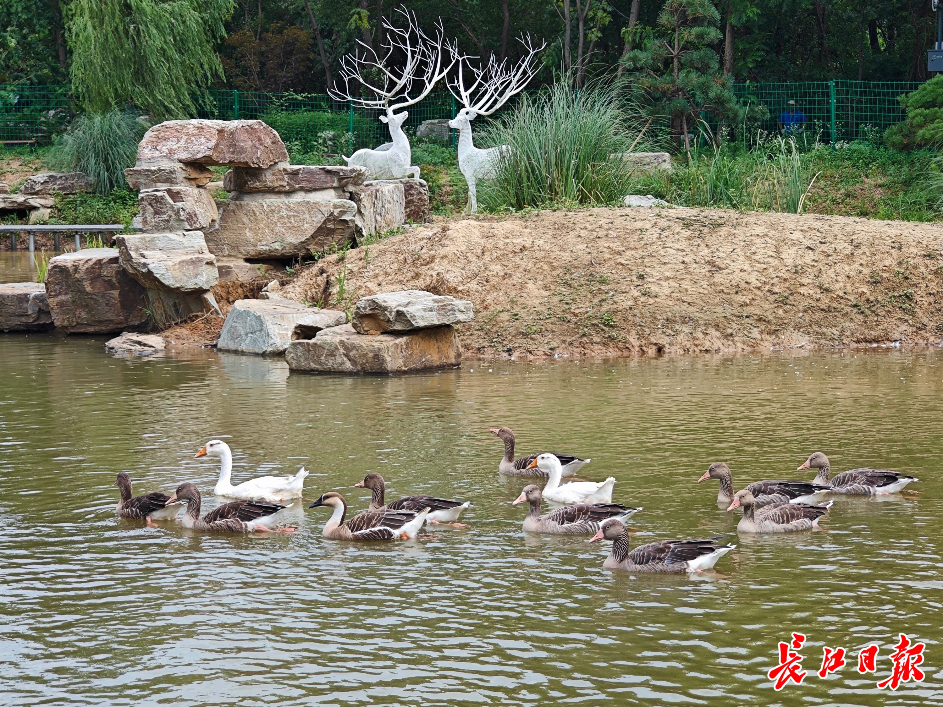 记者获悉,在修建东湖生境雁岛时,生态守护是摆在首位的。在这里,雁、鸭、天鹅、鹭类、鹳类、鹤类和鹬类等湿地鸟类聚集。生境雁岛水禽修复,人工调控生物种群,通过放养动物、招引鸟类等措施构建完整食物链,吸引水禽筑巢。目前岛上饲养有黑天鹅、赤麻鸭、柯尔鸭、斑头雁、黑山羊、孔雀等动物。人工孵化饲养大雁,吸引野生大雁,打造出武汉大雁数量最多、品种最全,一年四季都有大雁活动的大雁生态园。
