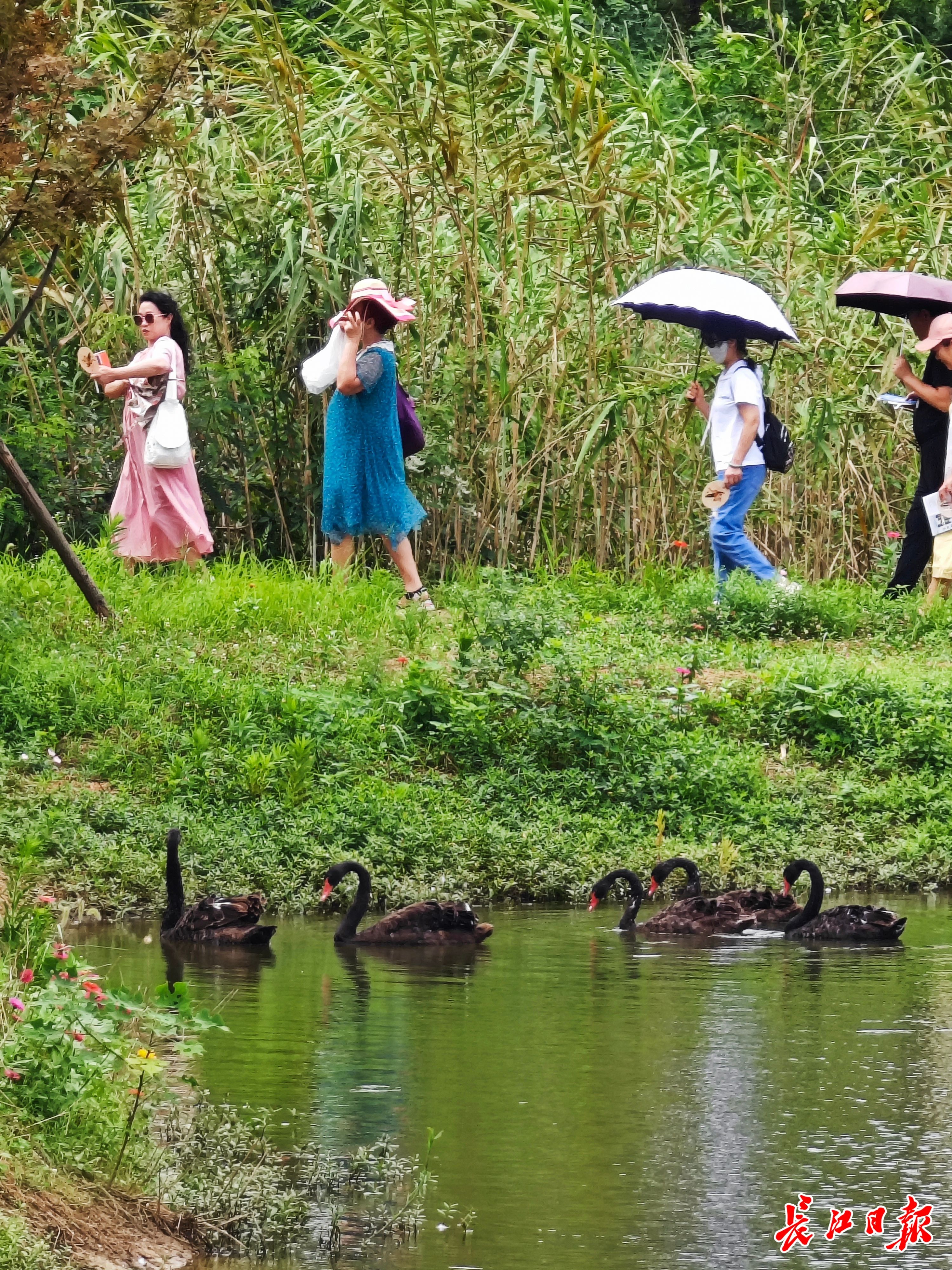游客们正在东湖生境雁岛畅游,身旁黑天鹅在池塘中栖息。 记者詹松 摄