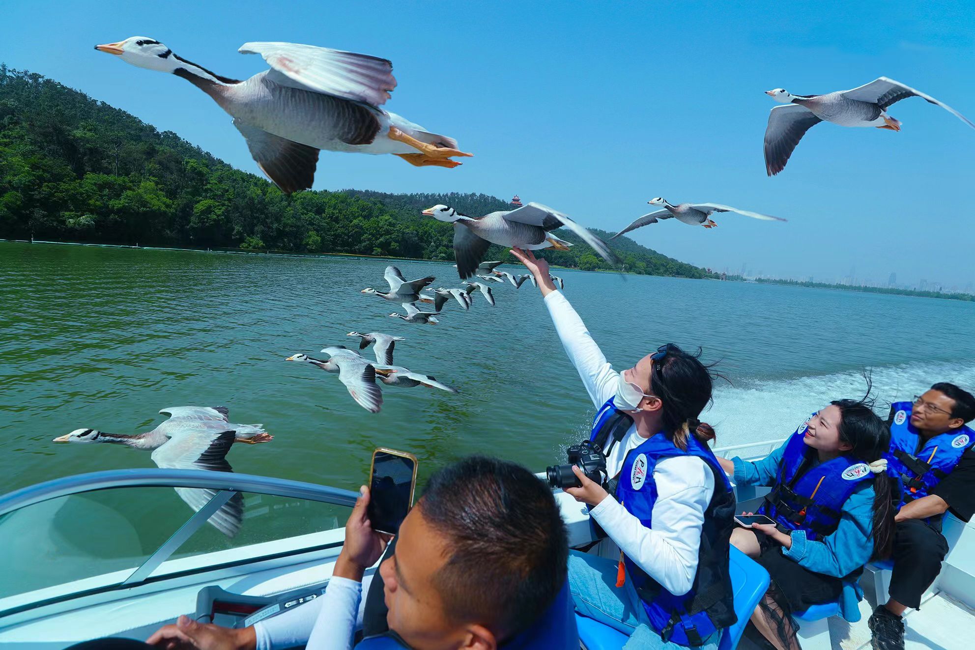 与大雁一起飞行是一种什么样的体验?18日上午,长江日报记者抵达东湖生境雁岛,一艘快艇载着游客在湖面上驰骋,数十只大雁跟随快艇,时而排成“人”字,时而排成“一”字,与游客一同在东湖水上畅游。