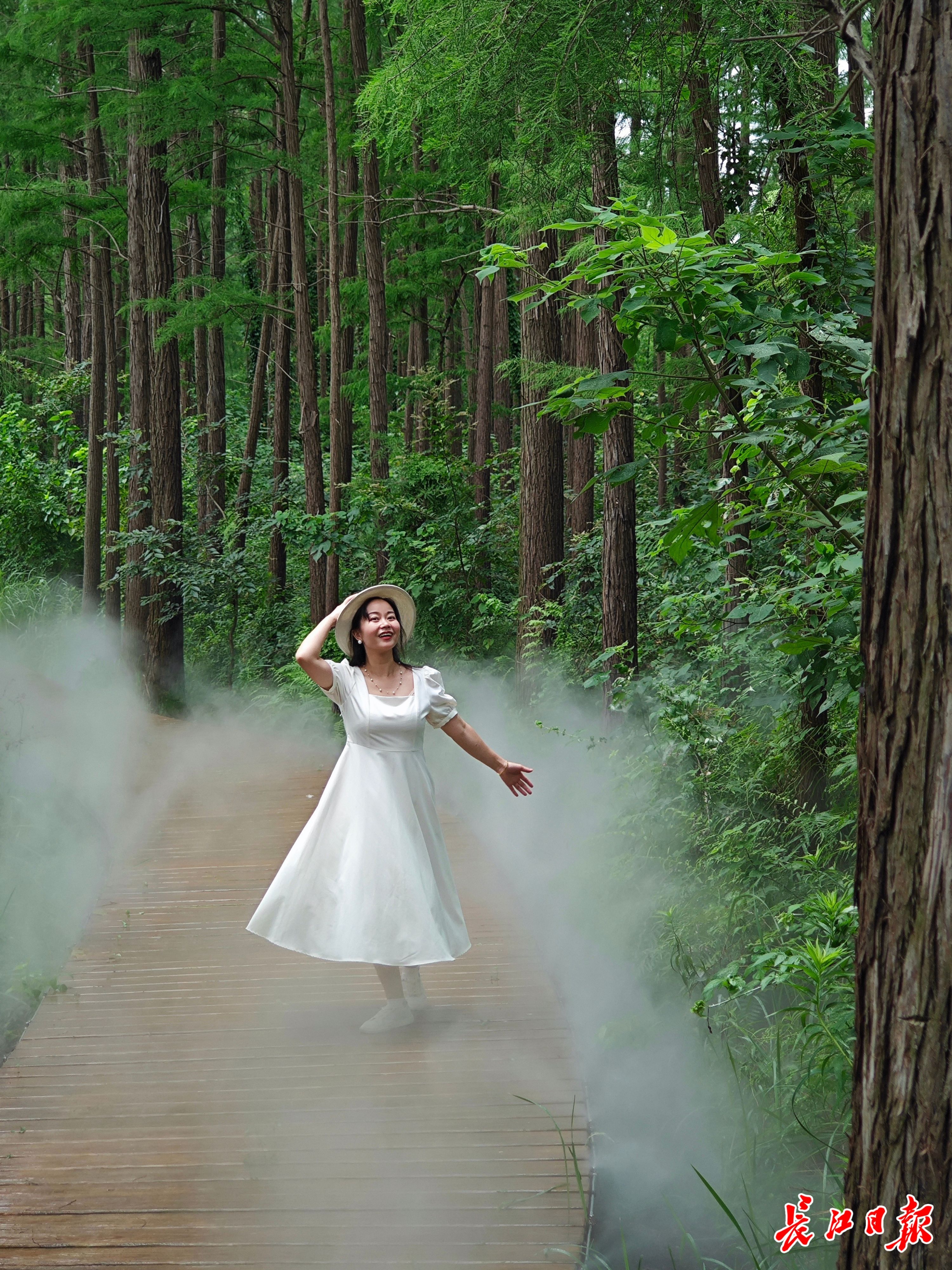 “我们在社交网络上看到了大雁伴飞的视频,特意坐高铁来玩!”来自湖南的杨女士和朋友在东湖生境半岛畅游着,路过秘境雾影区域时,正好碰上雾气弥漫,忍不住在杉林栈道间拍起照片和视频。“这片小岛很有野趣,好像真的进入原始湿地中,有很多东西可以去探索,很好玩,不虚此行!”