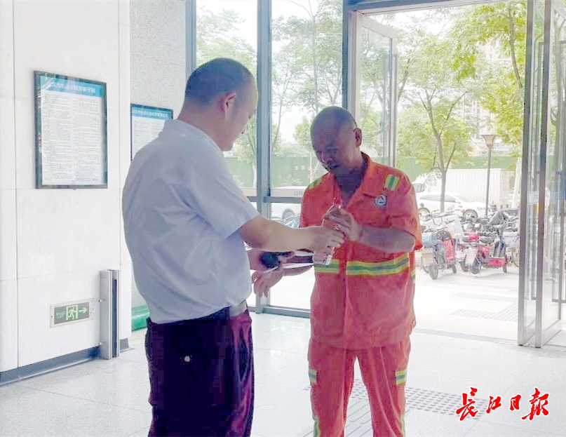 常青城站值班站长给环卫工人送水和扇子,邀请他进来纳凉。 通讯员王雯辉 摄
