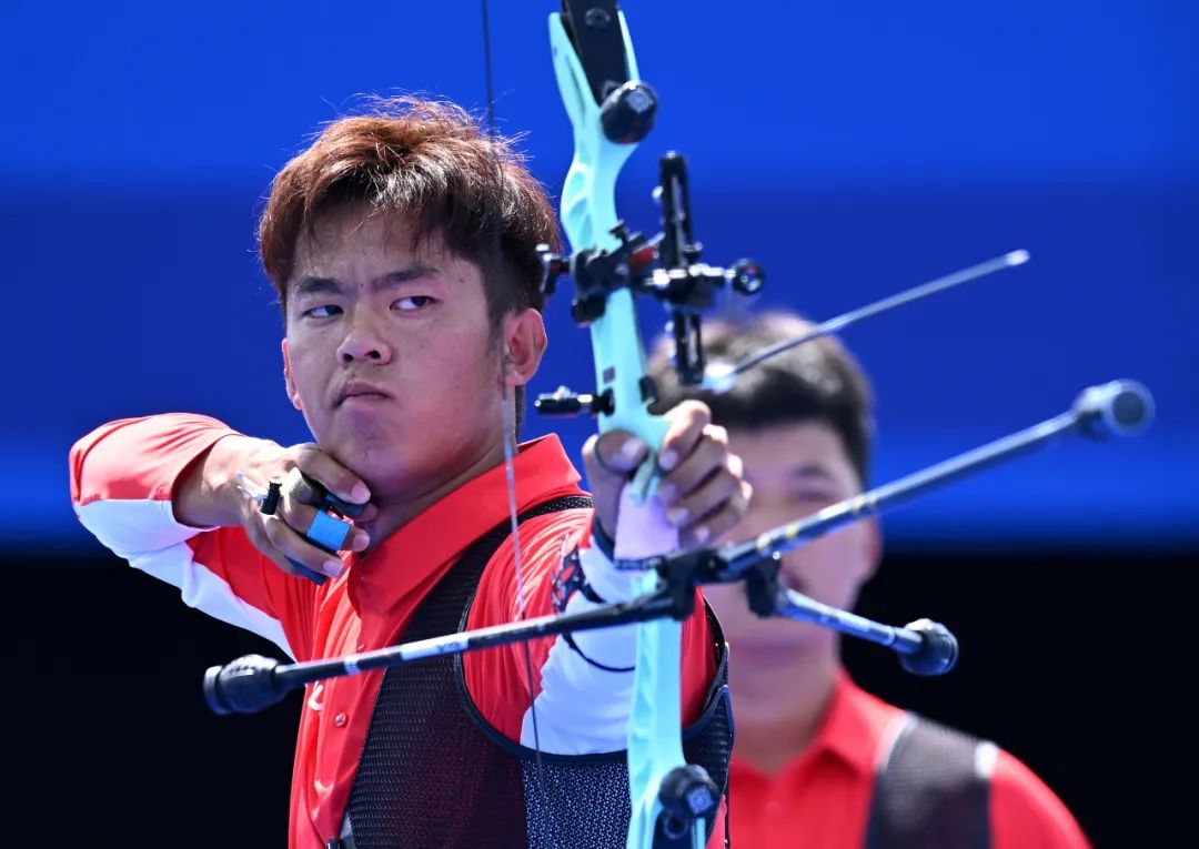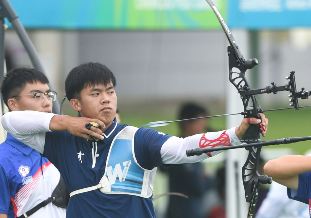 2023年7月27日,考文超在第31届世界大学生夏季运动会射箭项目男子反曲弓团体四分之一决赛中。新华社记者邓华 摄