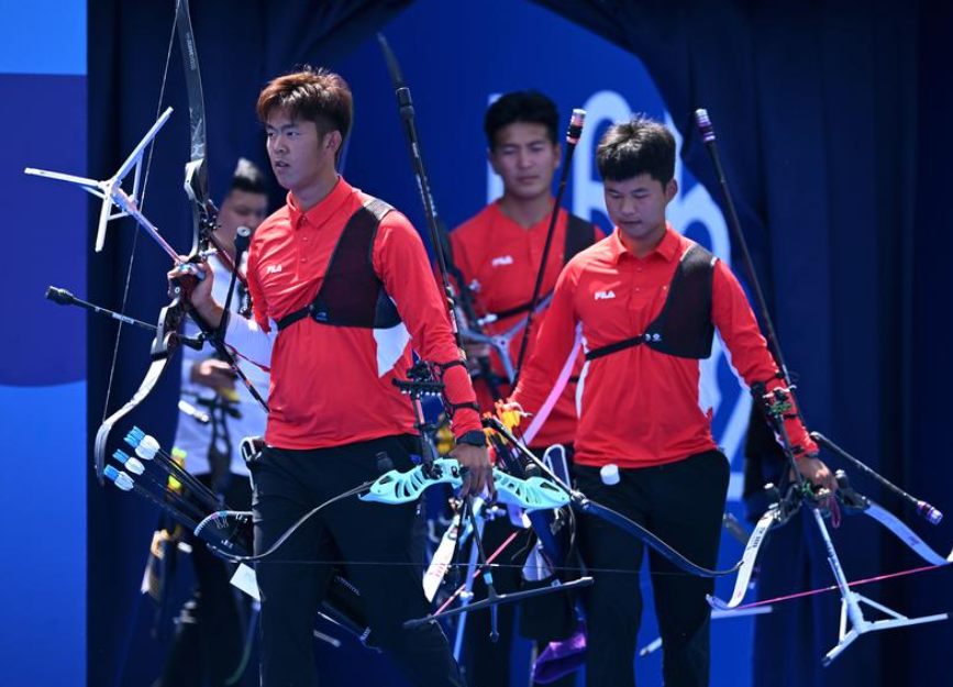 7月29日,巴黎奥运会射箭男子团体四分之一决赛,中国队选手在赛前登场。新华社记者贺灿铃 摄