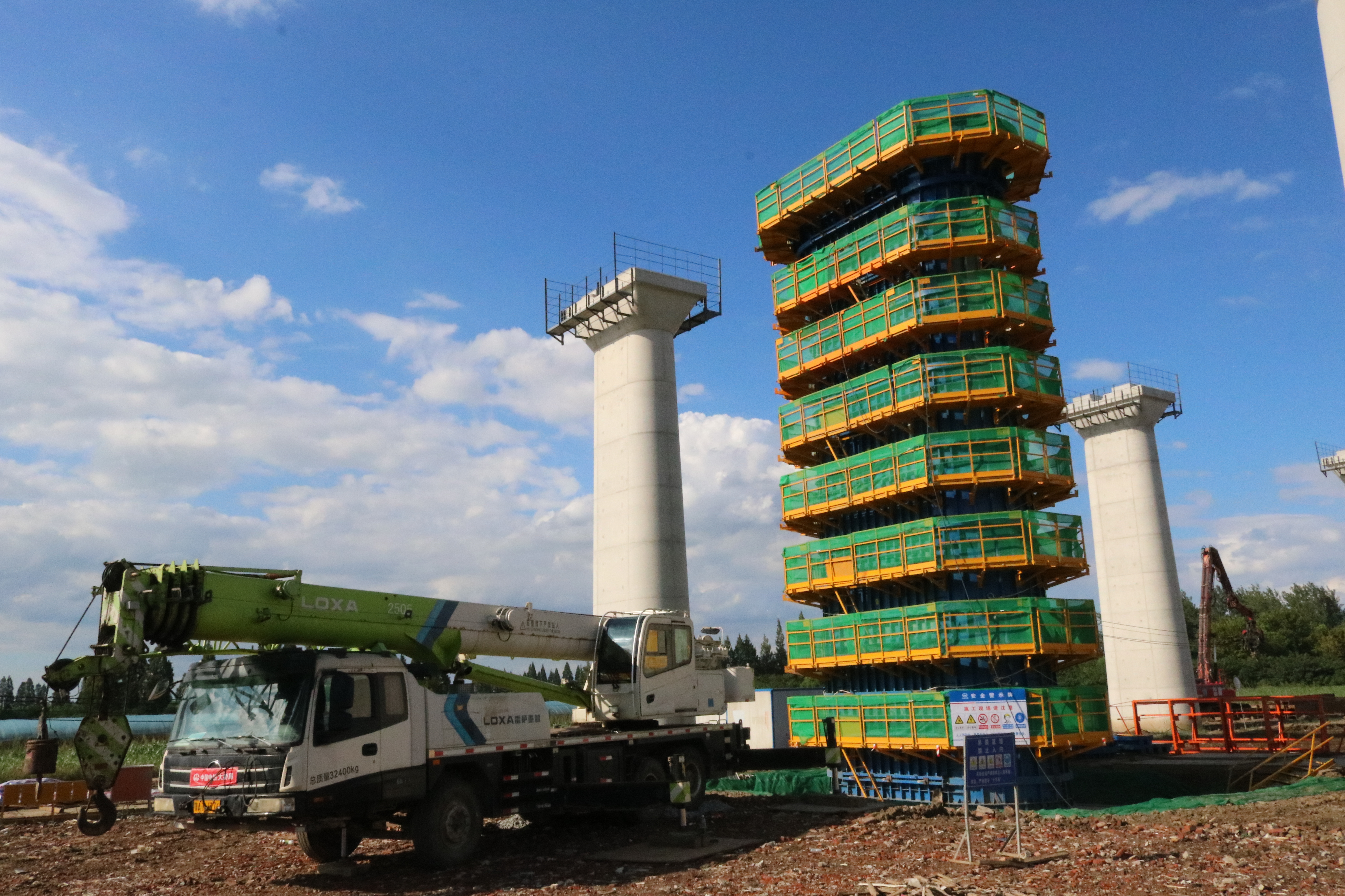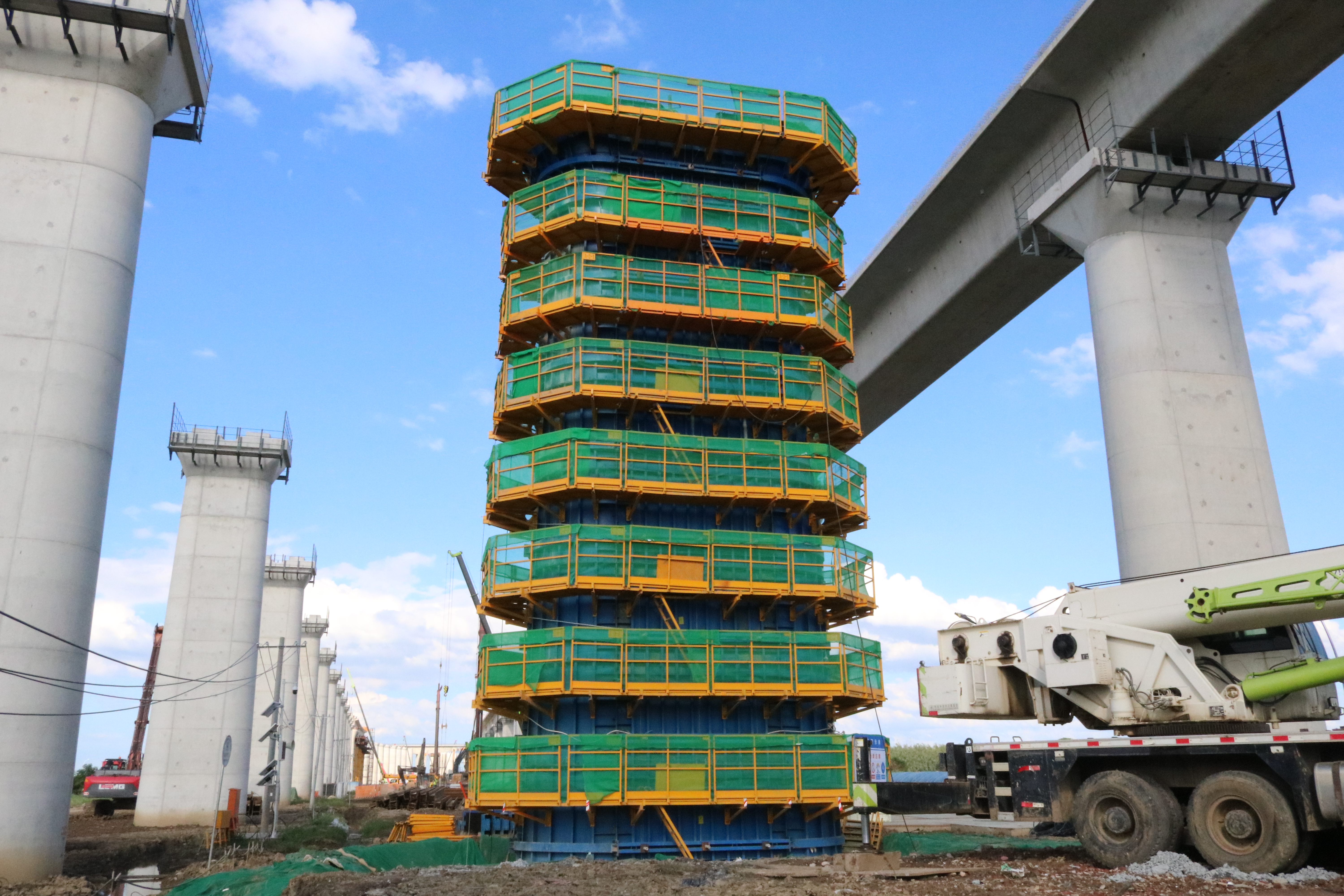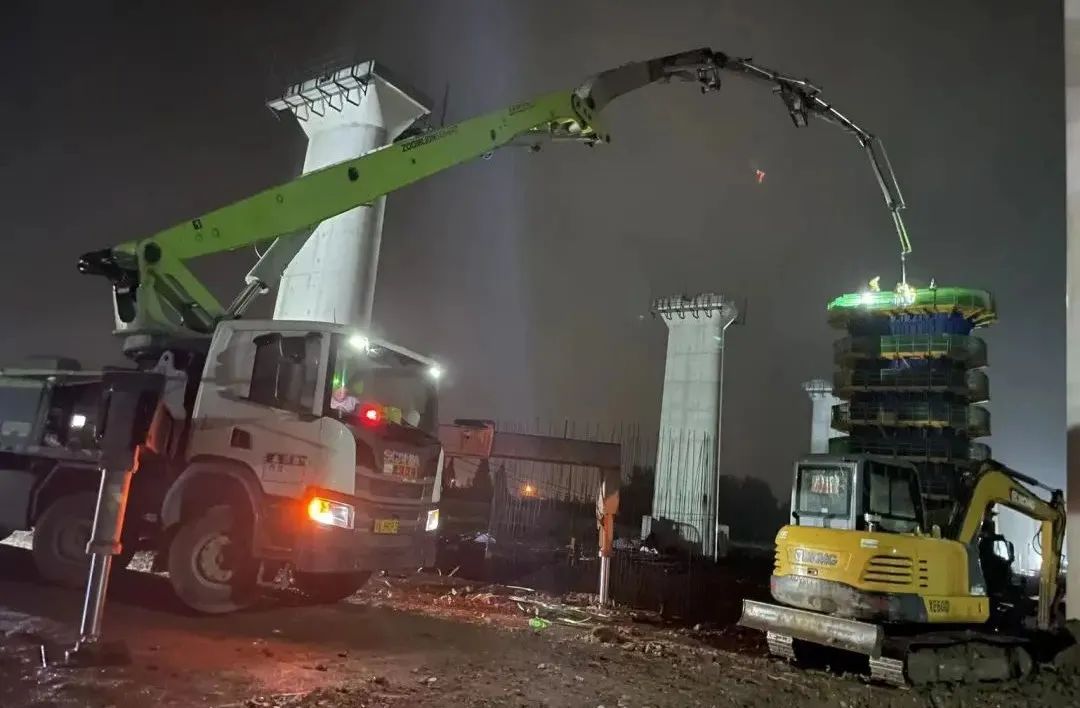 现场负责人李新元介绍,此次浇筑的813号桥墩为圆端形实体墩,桥墩总高17.5米,该桥墩采用分节浇筑施工,共计浇筑2次,第一次浇筑10.5米,此次浇筑高度为7米(含墩身4米+墩帽3米)。