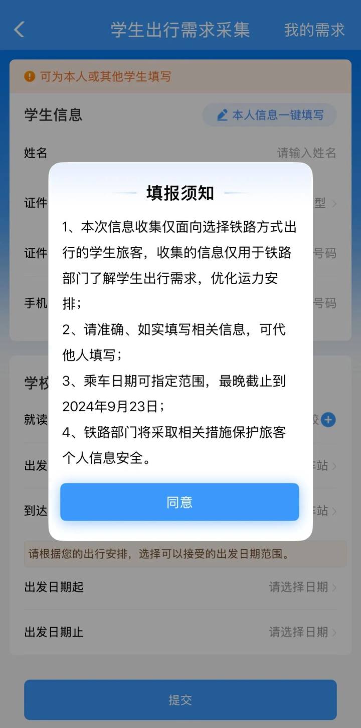 自8月20日至9月23日,对于12306注册用户类型为学生的(需要提前填写学生优惠资质核验信息),登录后在首页“火车票”购票界面,输入发到站、乘车日期,“直达”和“中转”页面查询结果,没有购票所需车次、没有中转推荐方案的,在“中转”页面显示“学生出行需求采集”。学生用户可为自己填报需求,也可代其他学生填报,可查询和删除本人提交的需求。铁路部门将密切关注学生旅客提报的出行需求,对没有直达车或没有中转方案推荐的需求重点分析研判,统筹考虑行车安全和运力资源,尽最大努力做好运输保障。
