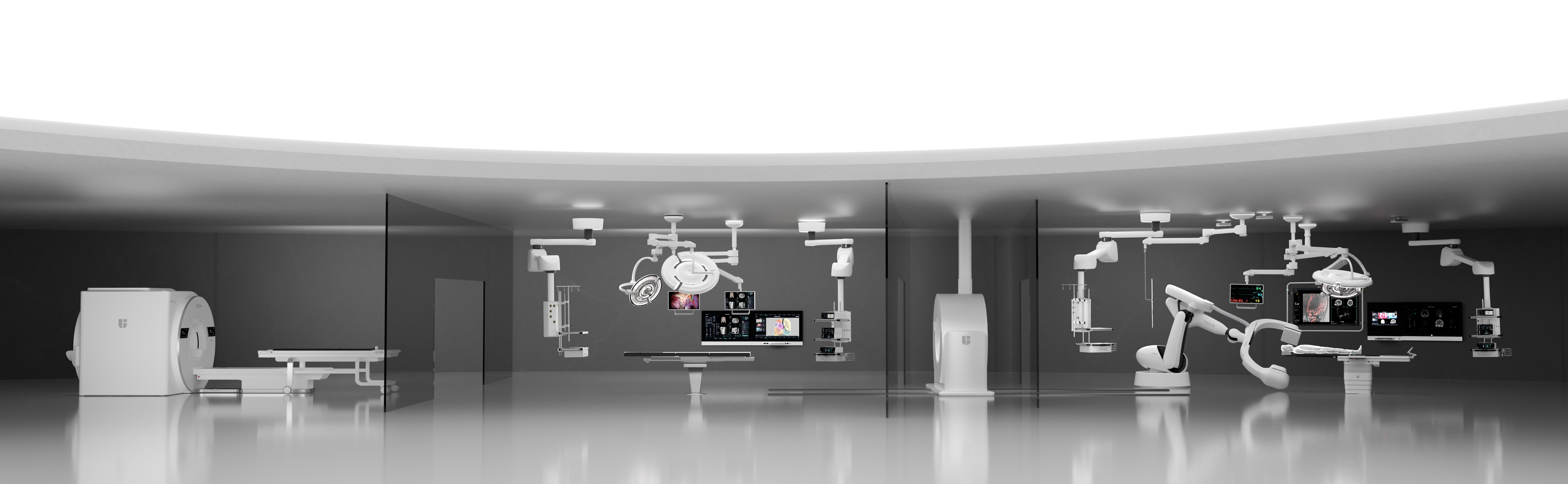 记者在发布现场看到,元手术室包含业内首款超大孔径术中MR、业内首款与机器人融合的术中滑轨CT、10轴DSA等先进术中影像设备,还有手术机器人、腔镜、超声刀等治疗装备,以及无影灯、吊臂、吊塔等手术室基础设备。值得一提的是,这些设备均由联影集团自主研发。