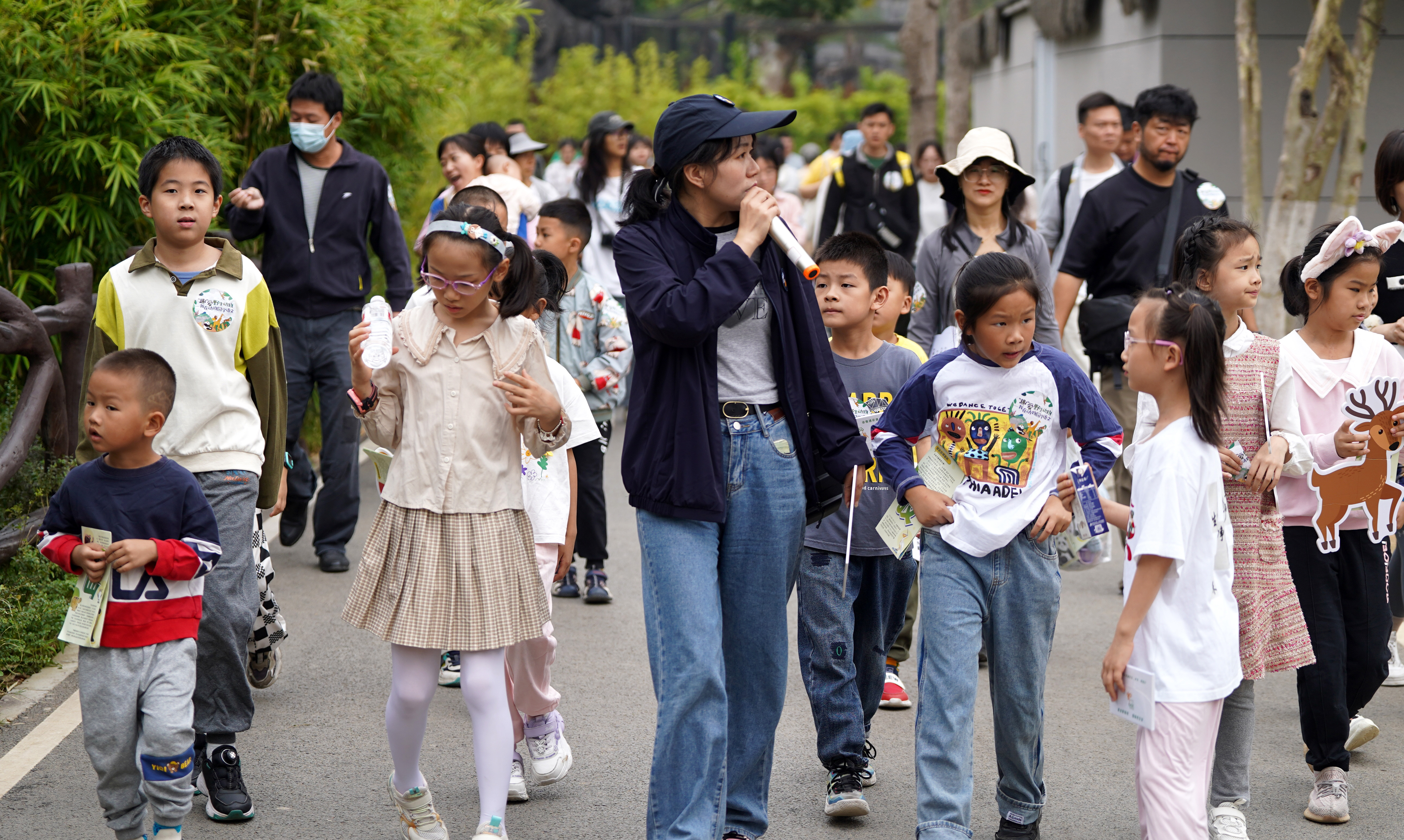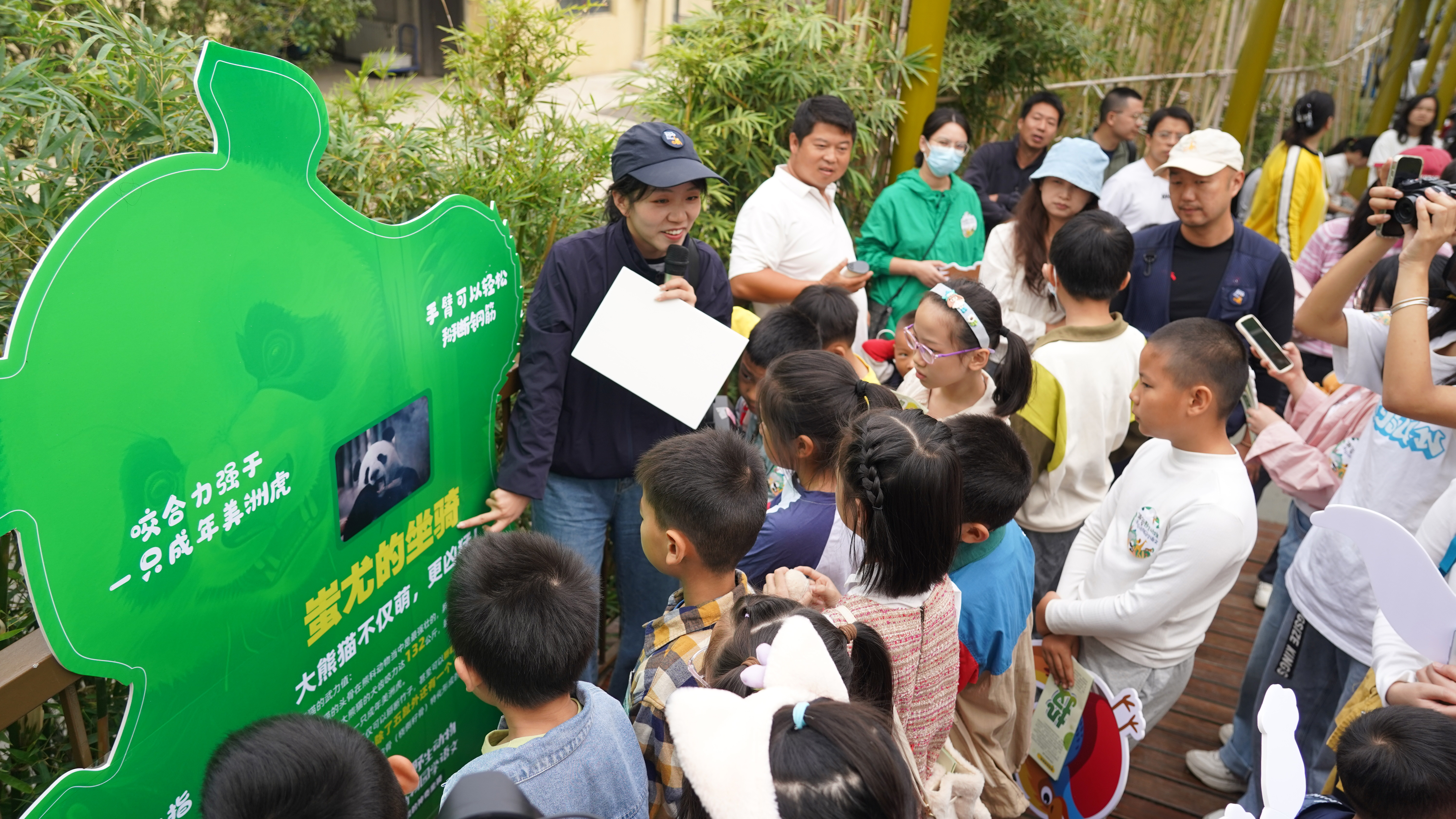 乐霞在亚洲区熊猫竹海给研学参与者讲解大熊猫相关科普。