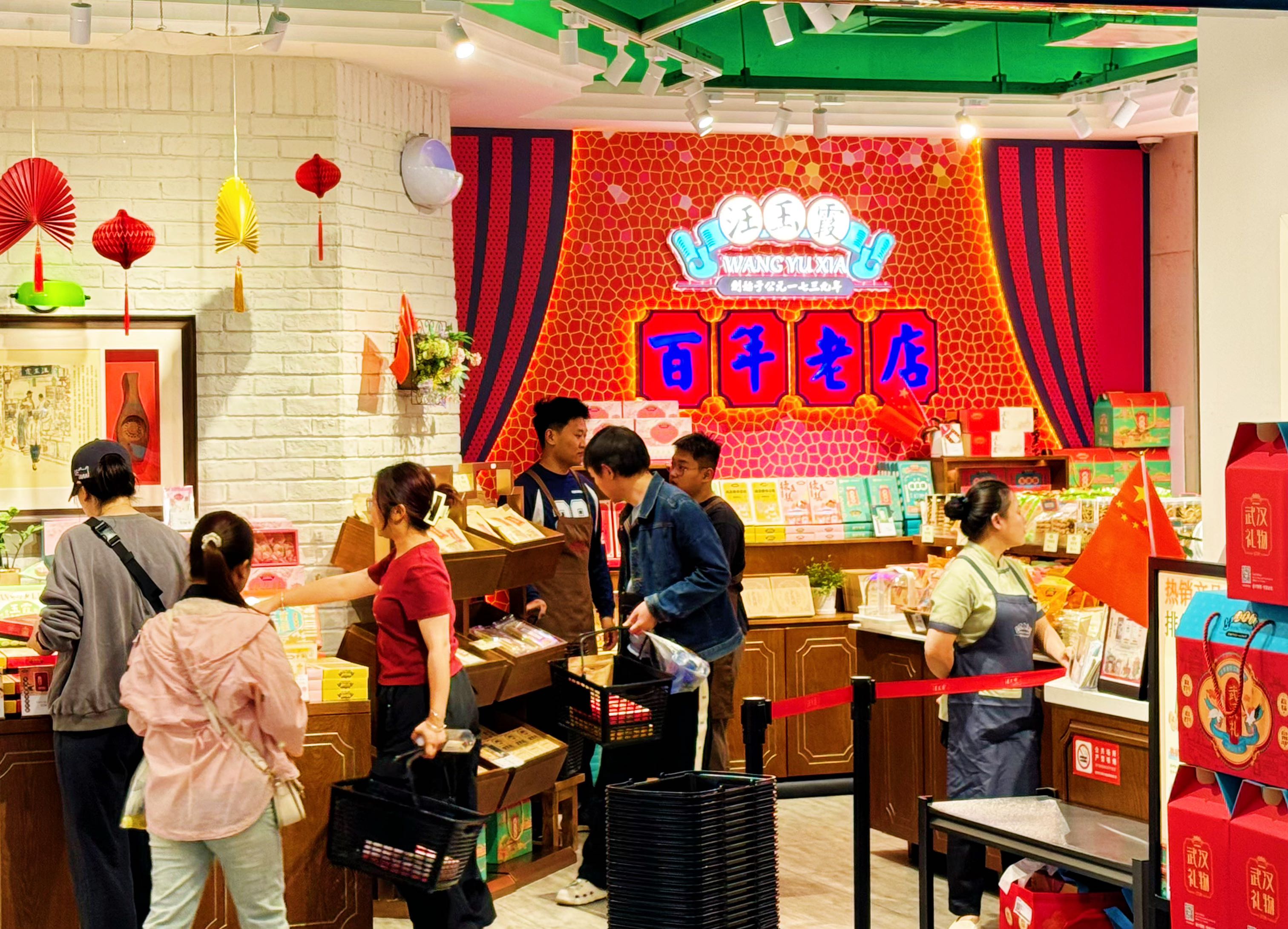 10月7日,国庆节最后一天,汪玉霞吉庆街门店里,游客拖着箱子选购点心。绿豆糕、蛋黄酥仍是爆品。来自山西运城的林小姐第一天来到武汉,品尝了汪玉霞的绿豆糕后便念念不忘。她说:“绿豆糕入口即化,而且不会太甜,很适合我们家人的口味。”在返程前,林小姐特意拖着箱子来到汪玉霞门店,多买了一些绿豆糕和其他点心,准备带回家给亲朋好友品尝。