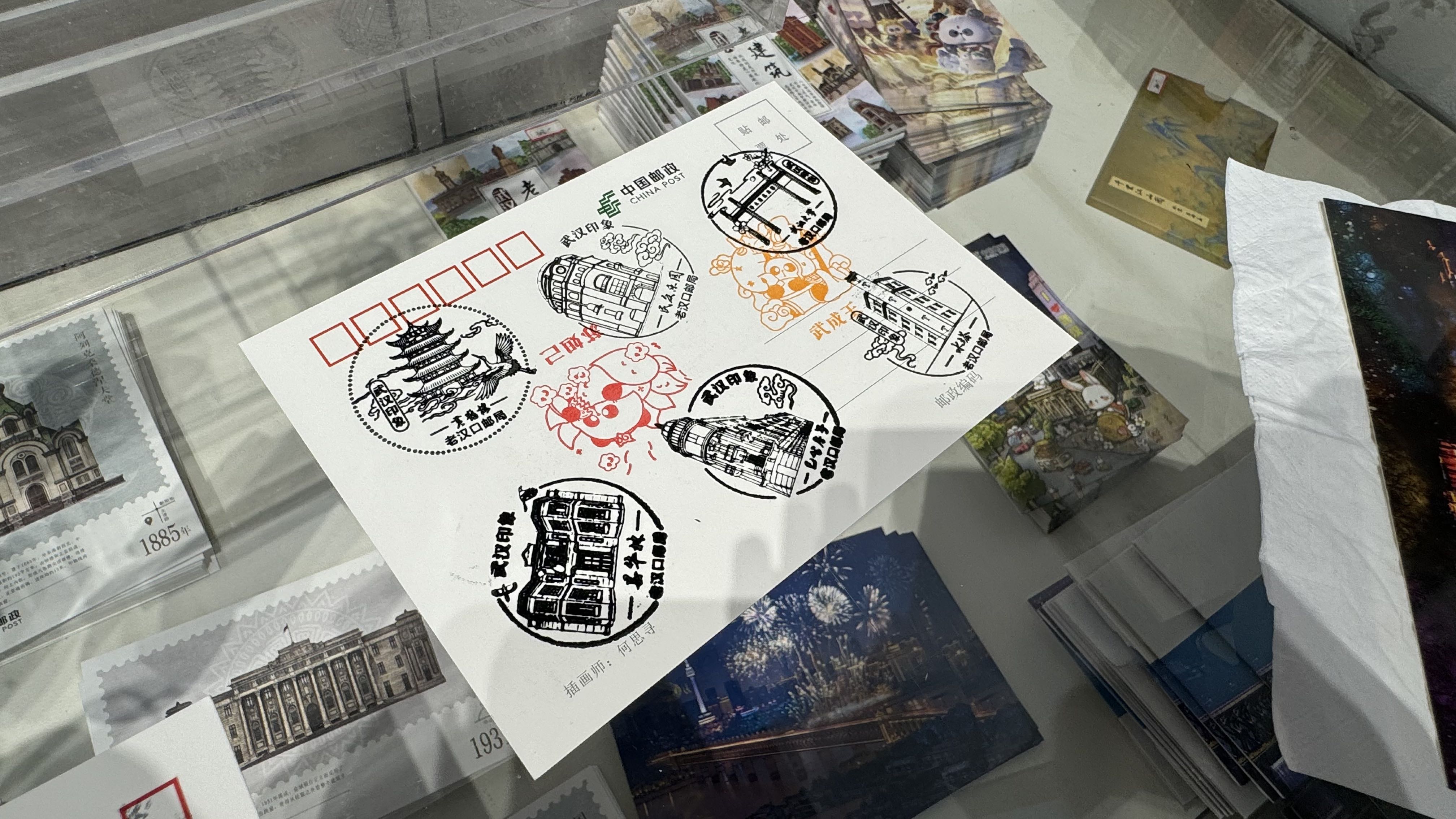 中国邮政推出的武汉城市系列明信片,上面分别印有大智门火车站、四明银行汉口分行、汉口水塔、六也村、江汉村、国营招商局汉口分局等地标图案。购买明信片后还能在柜台自助盖章。“拿上明信片,一会儿还能走到水塔同框打卡。”小唐同学和男朋友买了四张明信片,后面分别盖满了不同建筑的印章。他们小心翼翼地将明信片铺在柜台上,等待油墨风干。