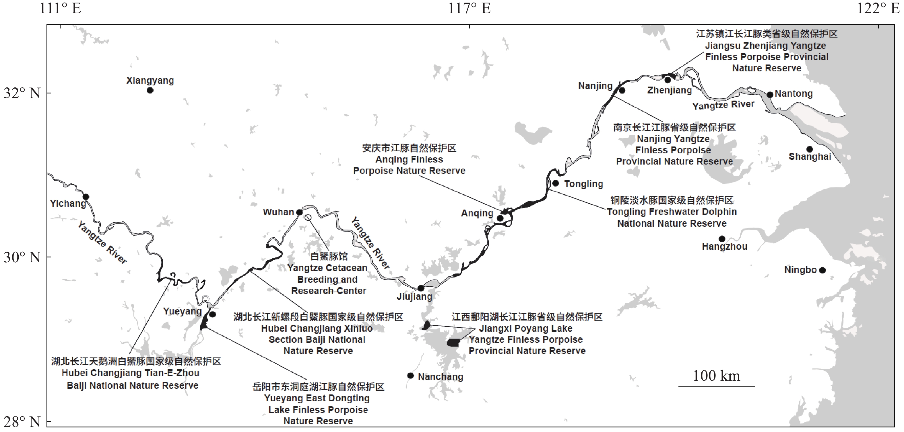 长江江豚自然保护区分布图(图表引自水生生物学报《长江江豚自然保护区建设管理存在的问题及调整建议》)