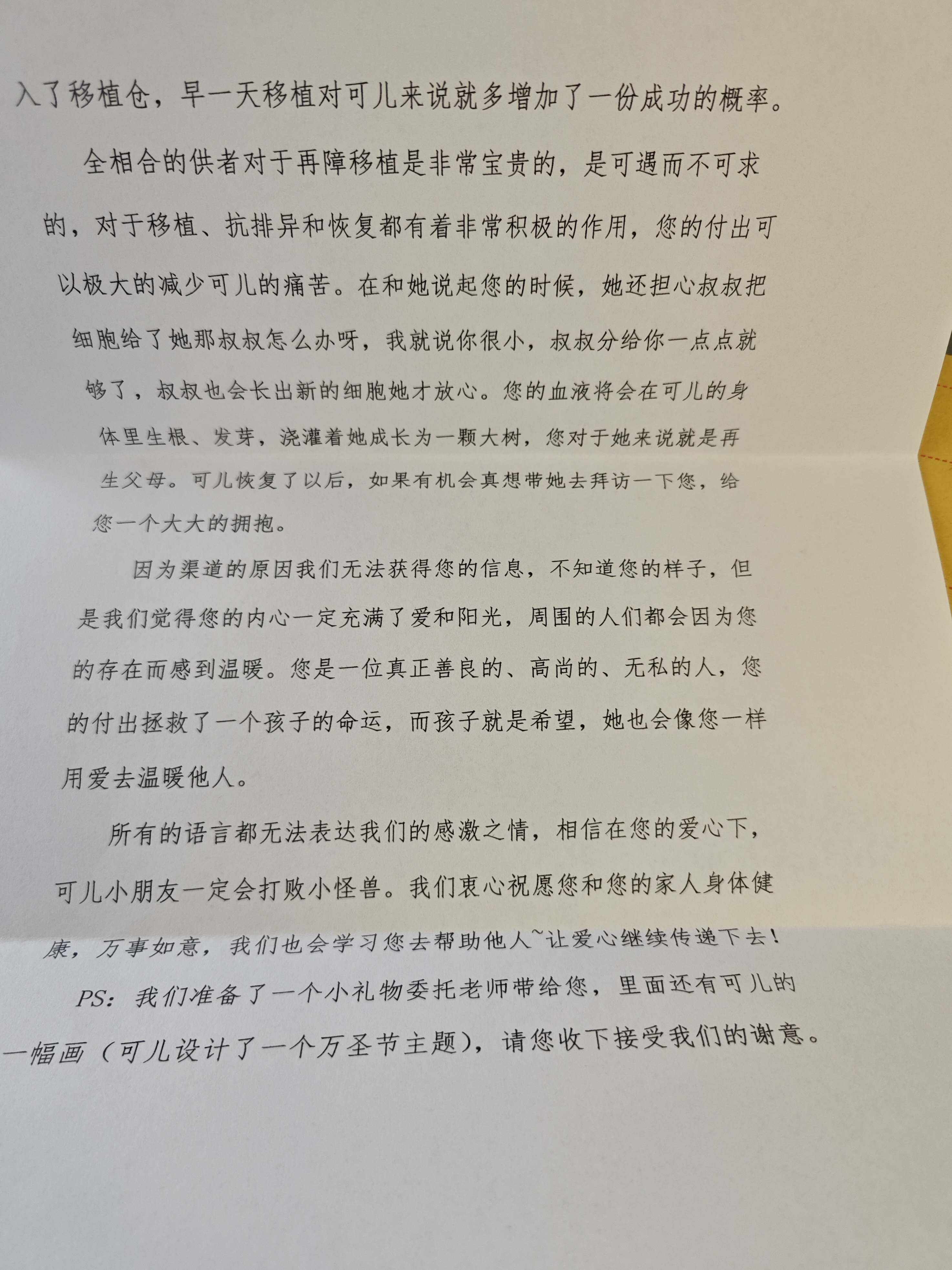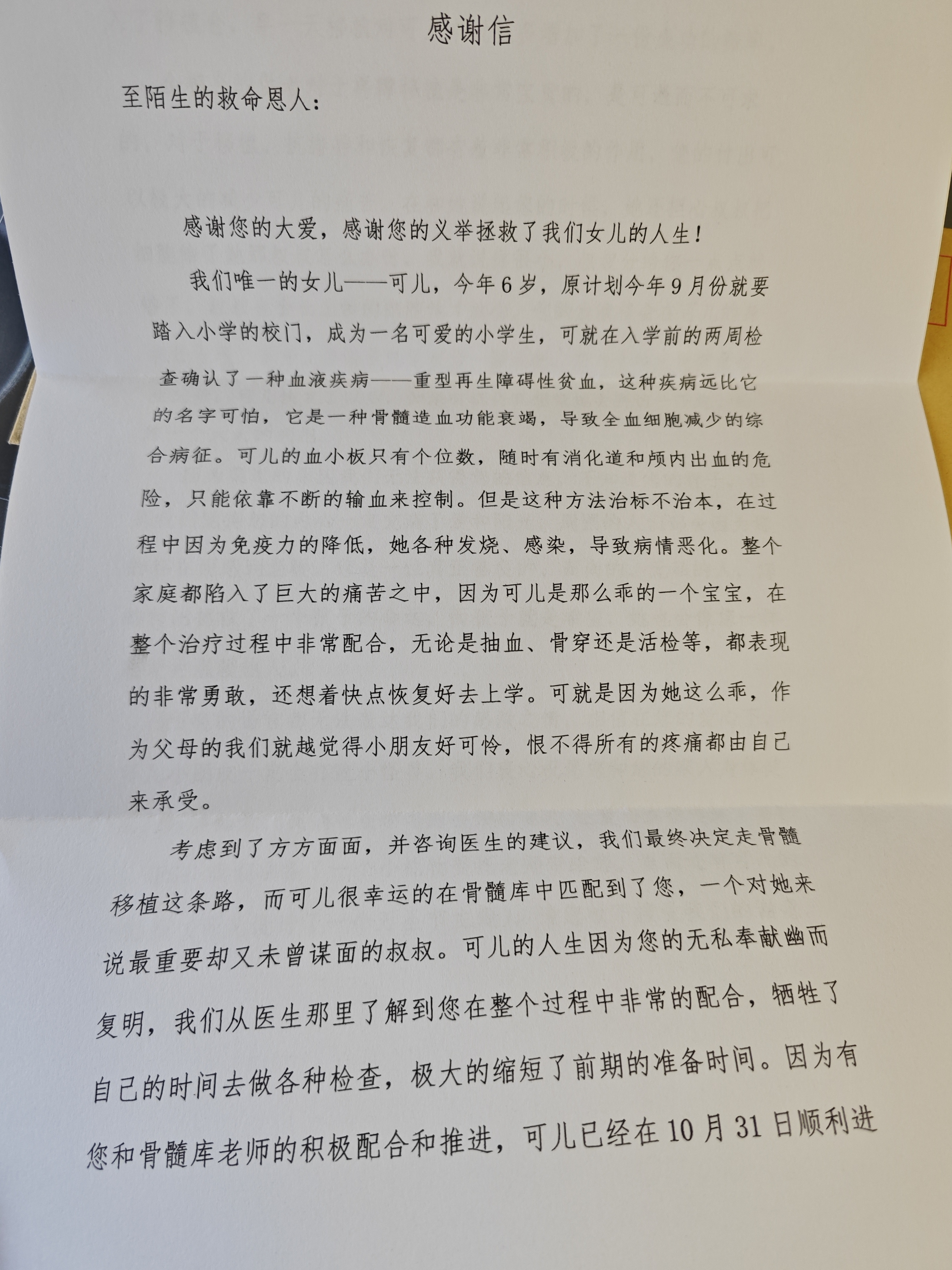 经历此次捐献后,刘宇感慨道,匹配成功很不容易,他认为目前身边许多人对造血干细胞捐献了解比较少,希望能通过自己的行动带动更多人参与,为更多生命点亮希望之光。
