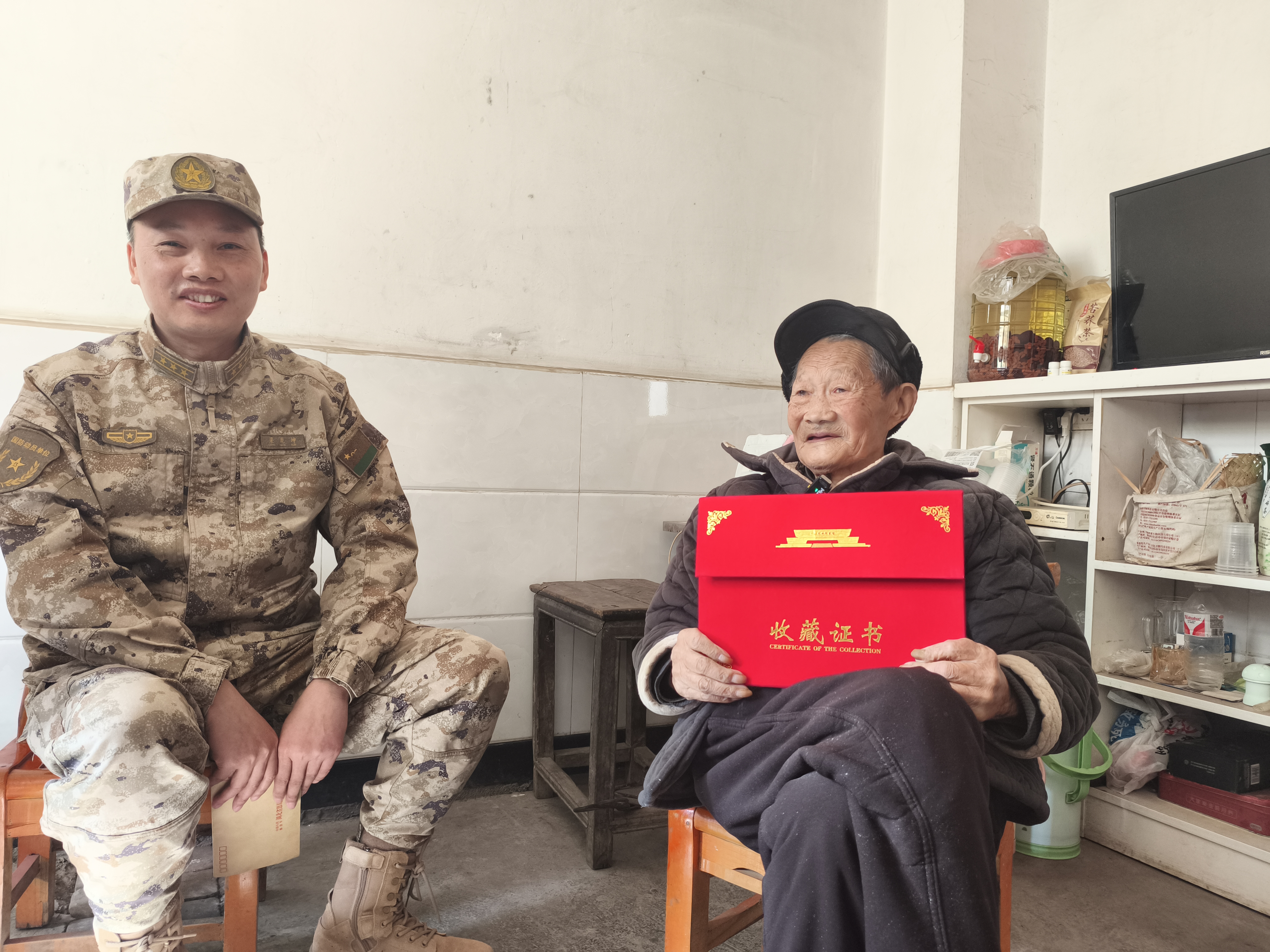 彭应发老人(右)收到湖北革命军事馆颁发的收藏证书。