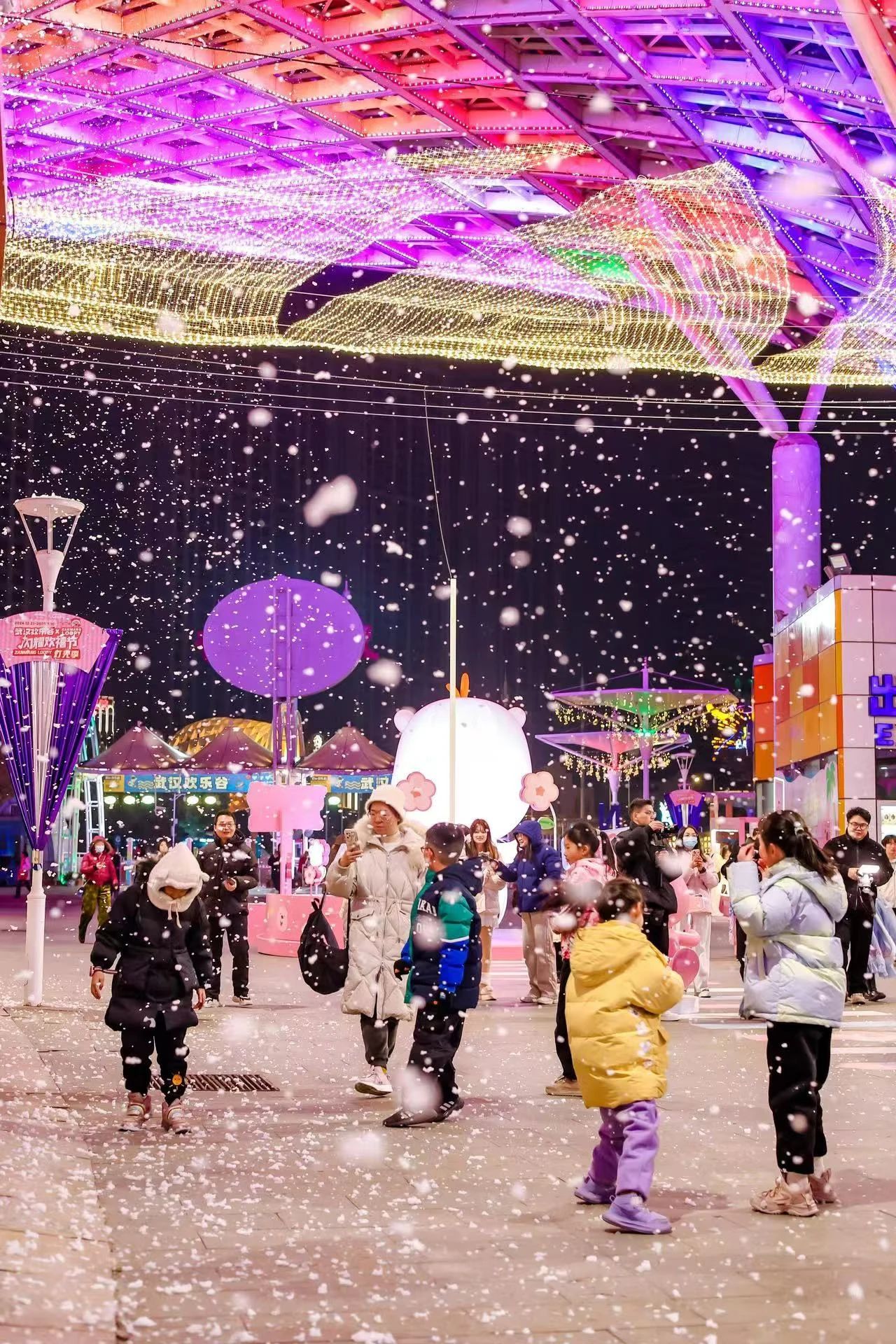 主题公园开启夜场狂欢。武汉欢乐谷正在举办闪耀欢禧节赞萌露比灯光季。园区变成35万平方米粉萌乐园,晚上不定时飘雪,超浪漫。武汉极地海洋公园则开启极地之夜新年音乐节,营业时间延长至21:00,用企鹅巡游、花灯、极光、飘雪,带大家在梦幻的海洋世界迎新年。