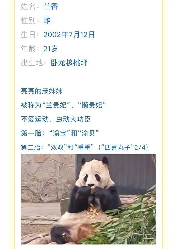 据重庆动物园,大熊猫“兰香”性别雌,2002年7月12日出生于卧龙核桃坪,是熊猫“亮亮”的亲妹妹。重庆动物园“四喜丸子”中的“双双”和“重重”,均为“兰香”2019年第二胎所生,除此之外,它还在2016年第一胎时,产下了“渝宝”和“渝贝”。作为重庆动物园的大功臣,“兰香”得名“兰贵妃”,因不爱运动,又被称为“懒贵妃”。