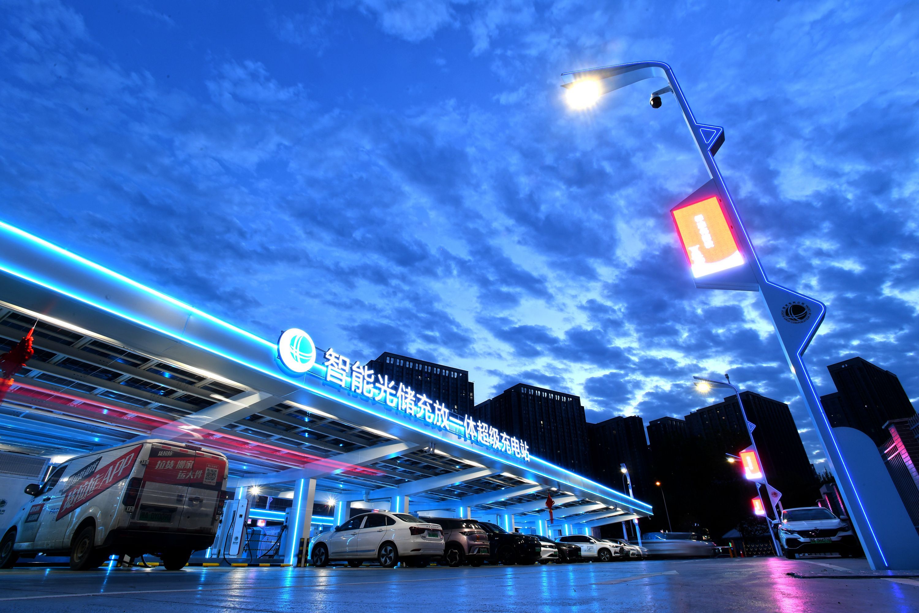 夜空下,南太子湖超级充换电服务中心未来感十足。
