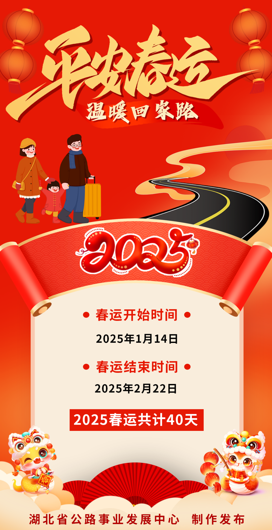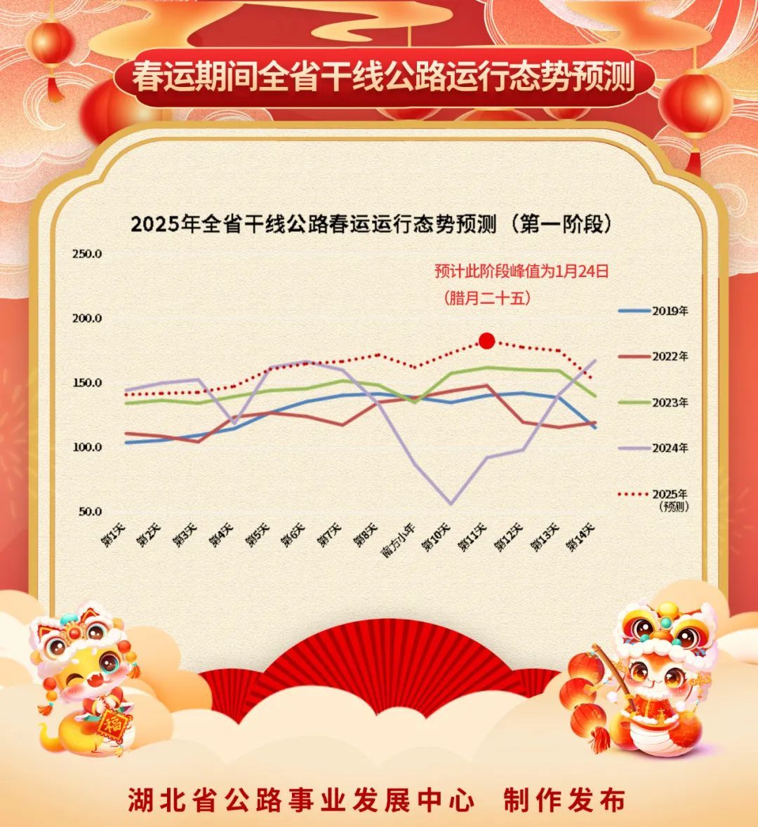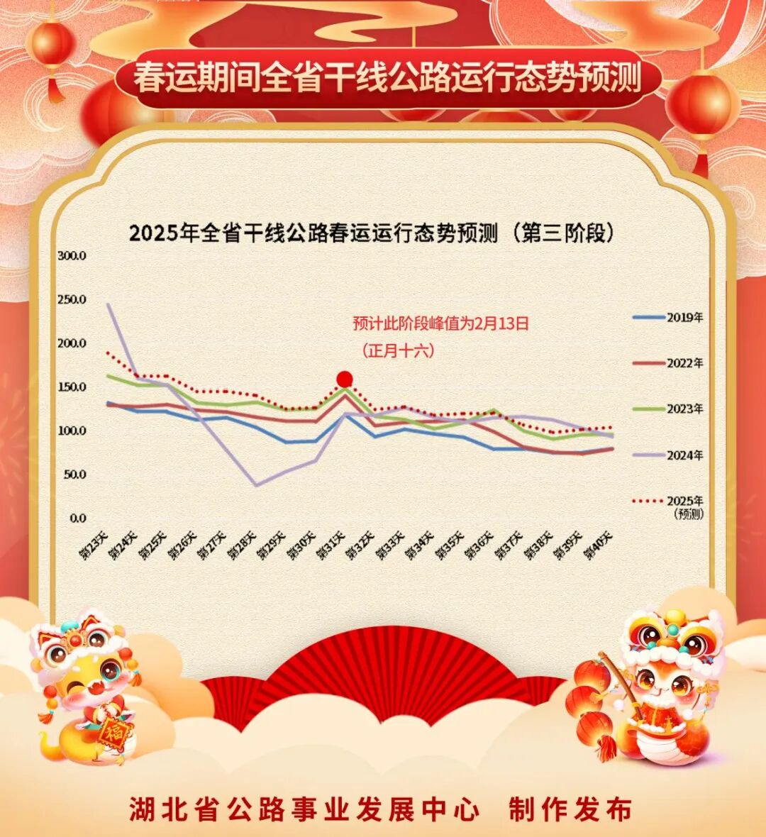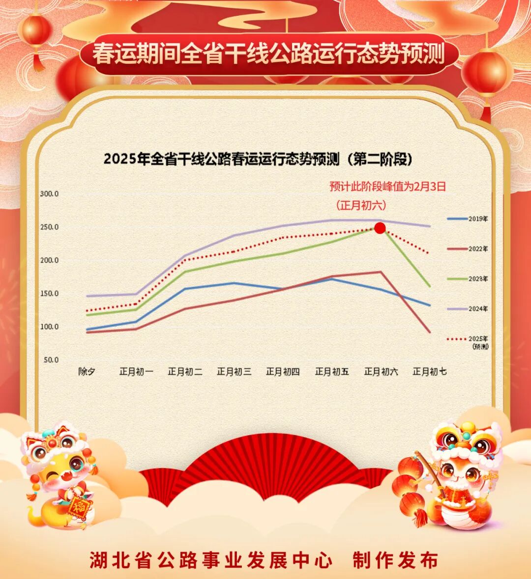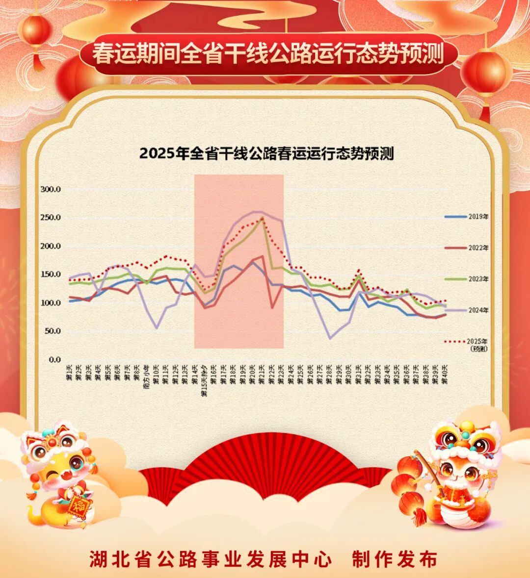 2025年春运从1月14日至2月22日,共计40天。湖北省公路事业发展中心根据历年来春运期间路网运行监测分析,预计今年春运全省公路网呈阶段性波动态势,呈现春运前期外地返乡车流攀升、春节前省内返乡车流高峰、春节假期探亲出行车流反弹、后期车流震荡走低态势。春运前期,车流主要集中在国高网路段,方向由南往北,由东往西;春运中期,车流以短途出行为主,省内重点城市周边道路车流明显增长;春运后期,人员返岗、返校,车流将明显增长,主要集中在国高网路段,方向由北往南,由西往东。