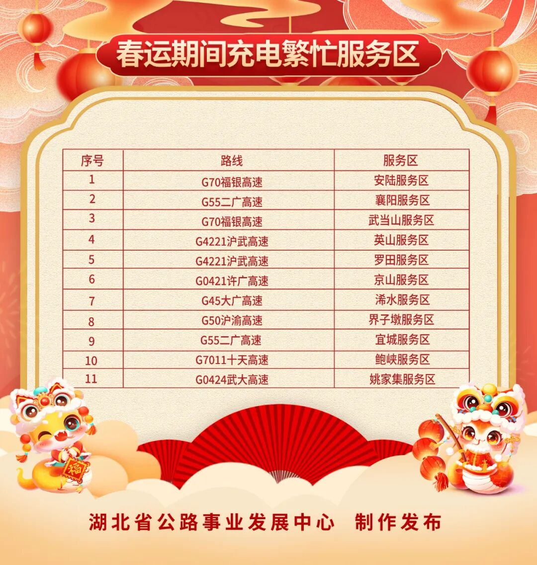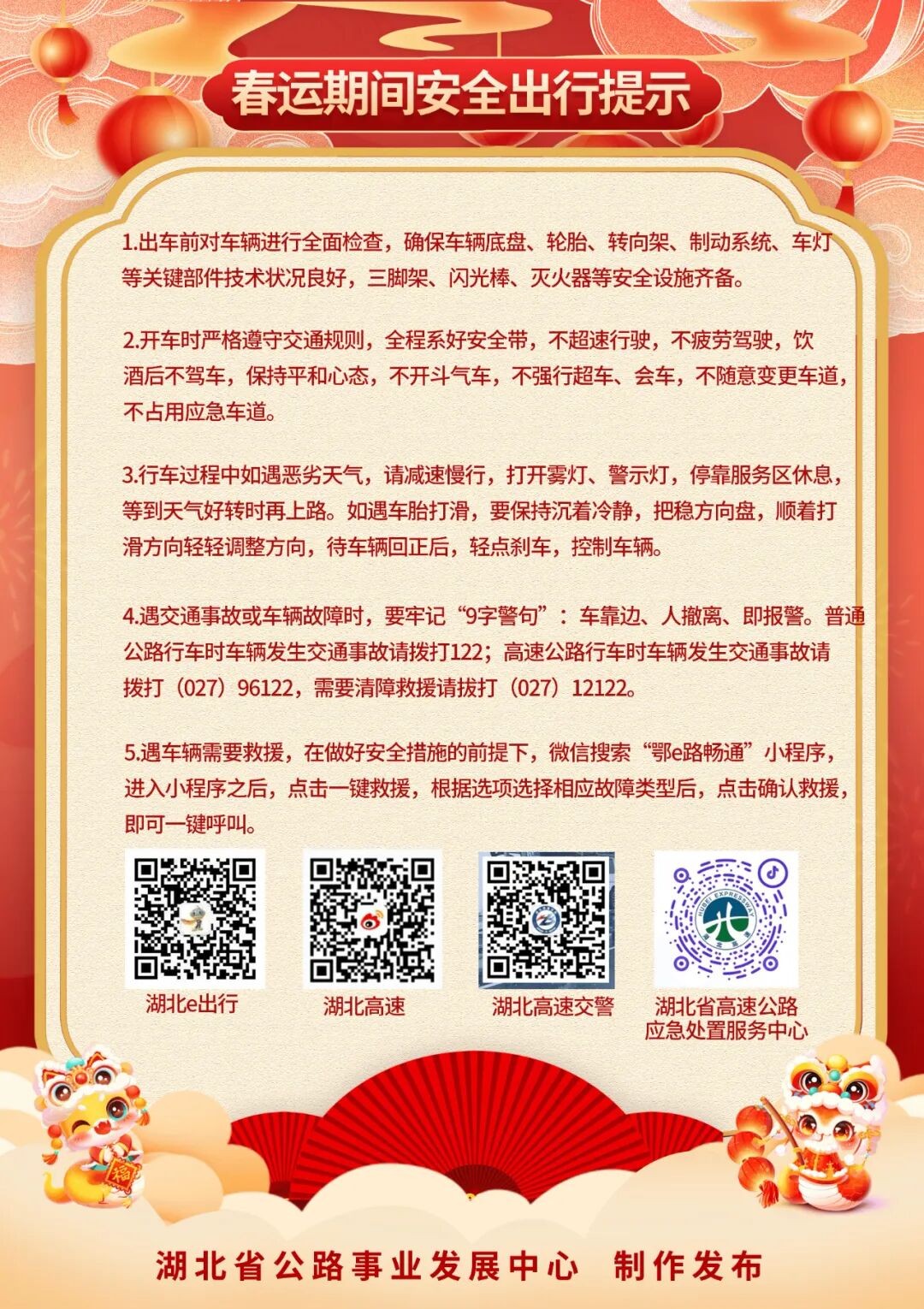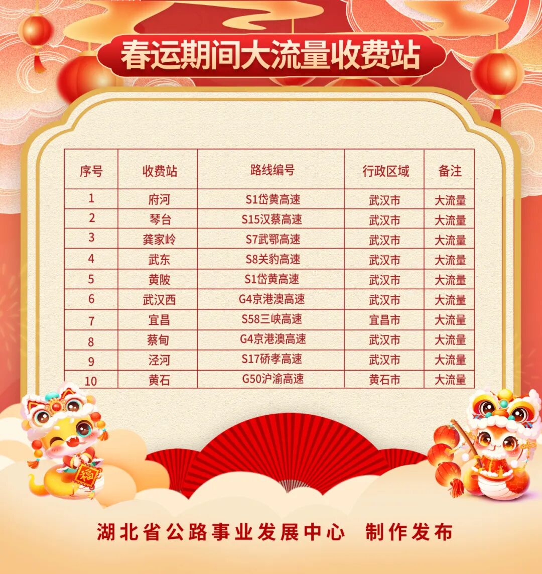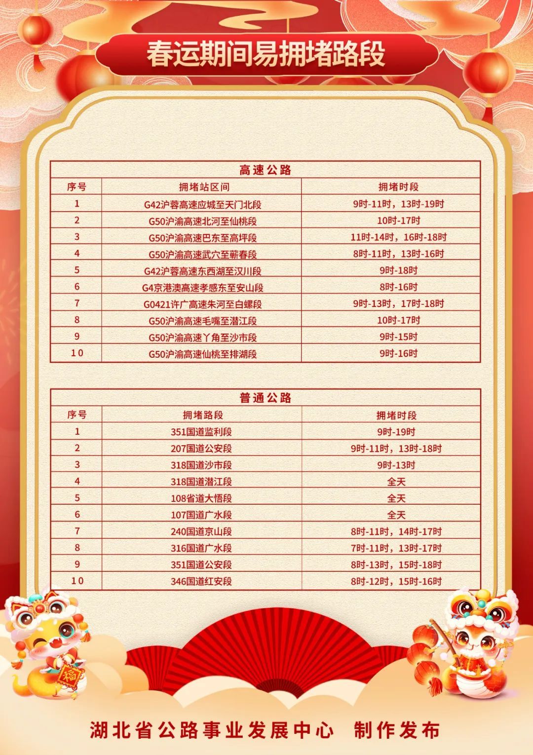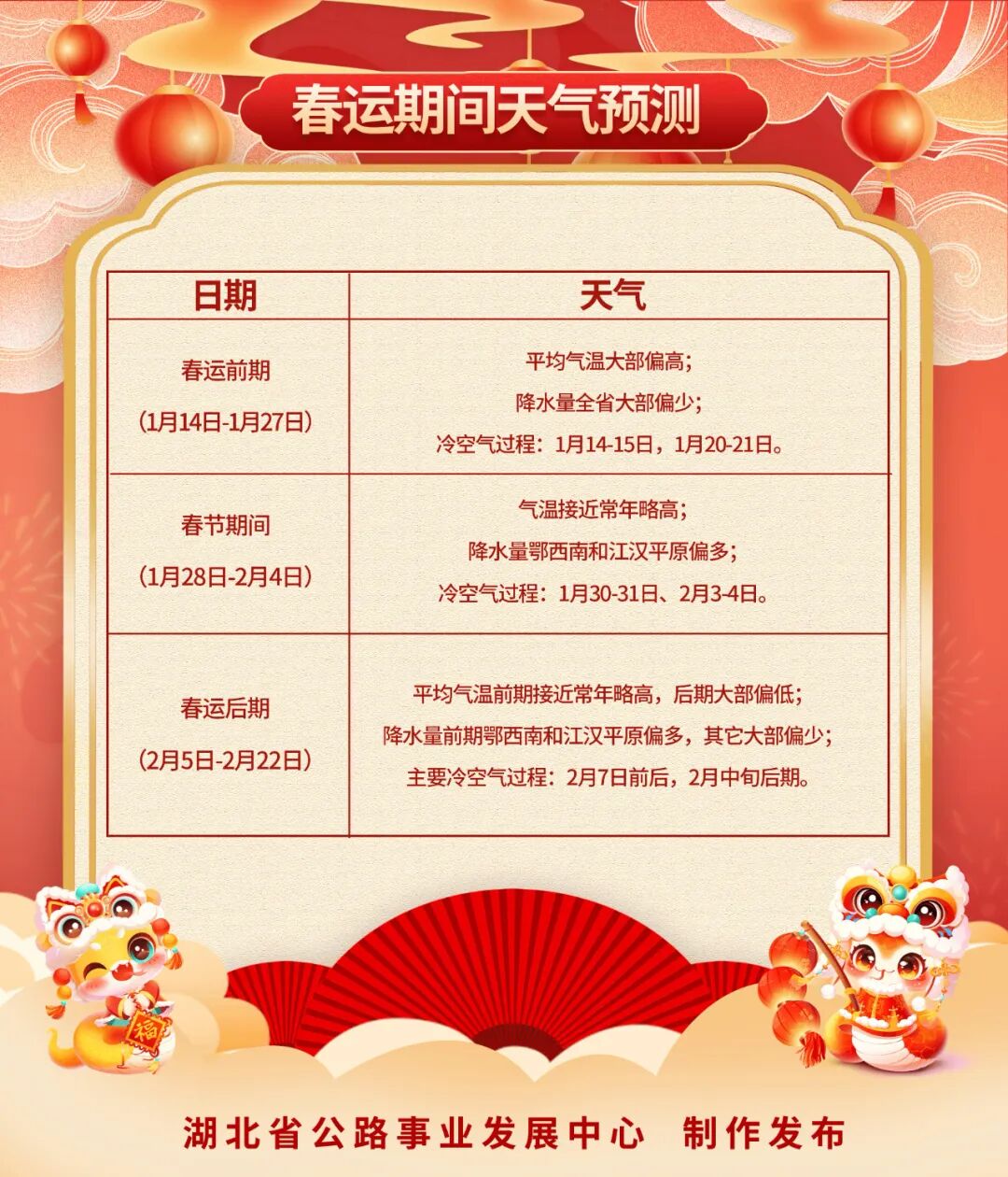 2025年春运从1月14日至2月22日,共计40天。湖北省公路事业发展中心根据历年来春运期间路网运行监测分析,预计今年春运全省公路网呈阶段性波动态势,呈现春运前期外地返乡车流攀升、春节前省内返乡车流高峰、春节假期探亲出行车流反弹、后期车流震荡走低态势。春运前期,车流主要集中在国高网路段,方向由南往北,由东往西;春运中期,车流以短途出行为主,省内重点城市周边道路车流明显增长;春运后期,人员返岗、返校,车流将明显增长,主要集中在国高网路段,方向由北往南,由西往东。