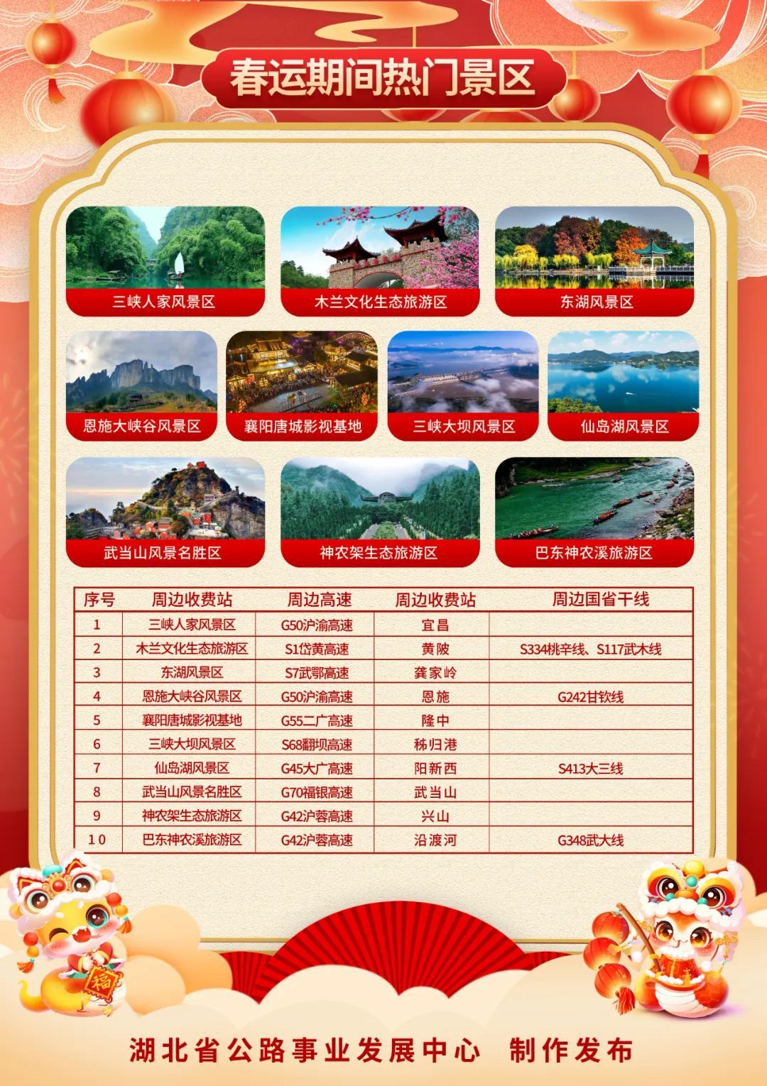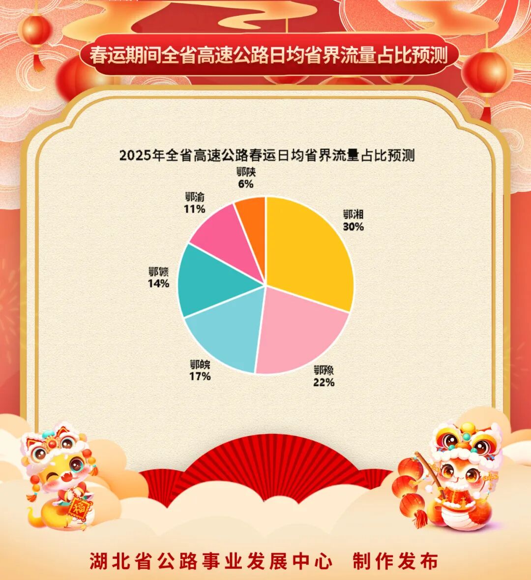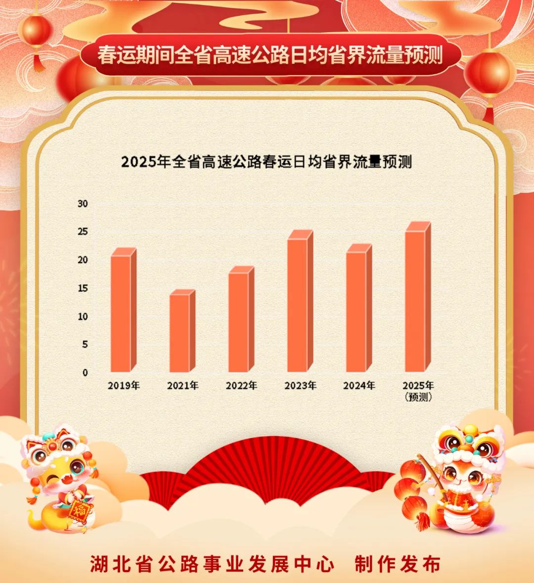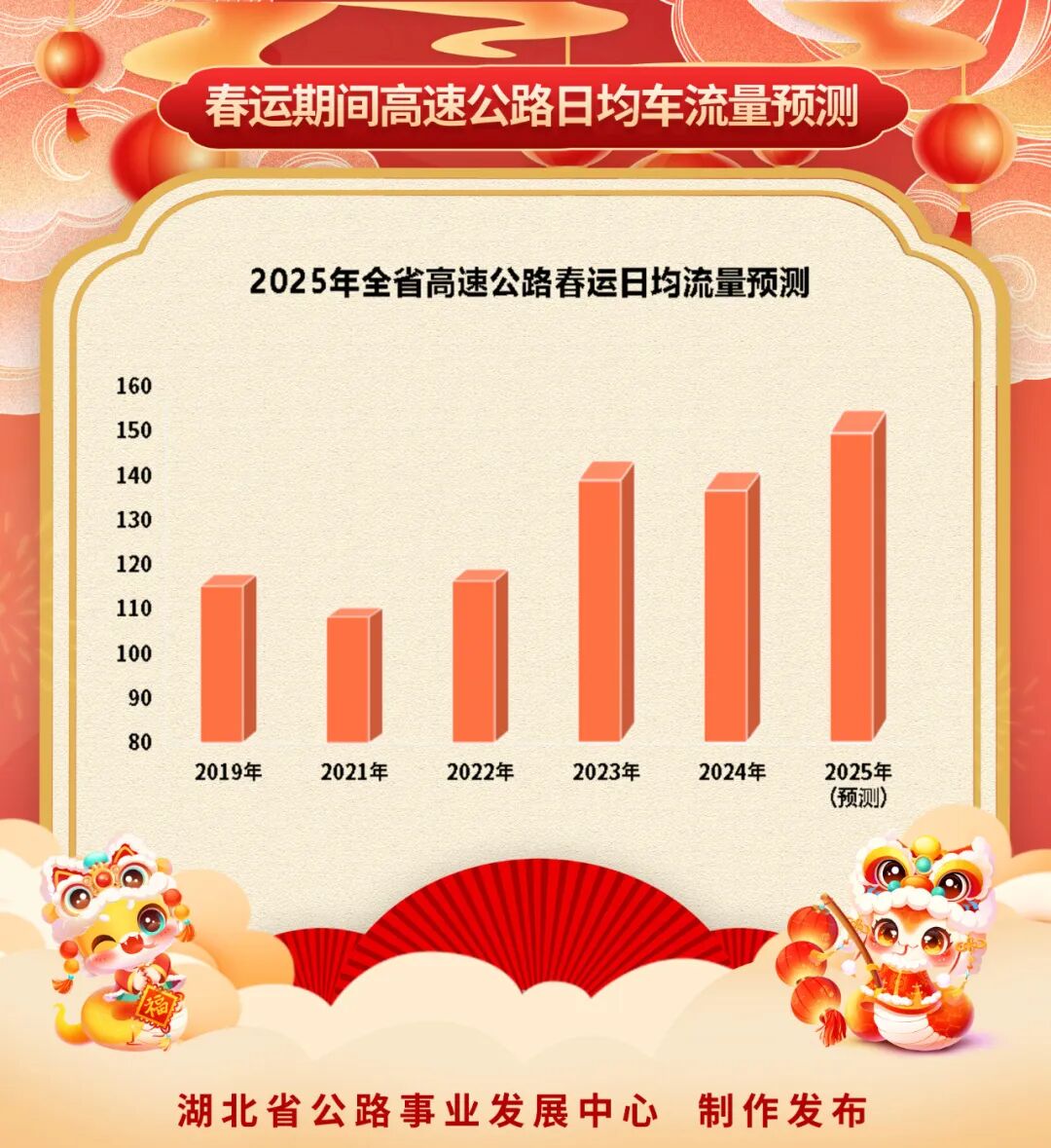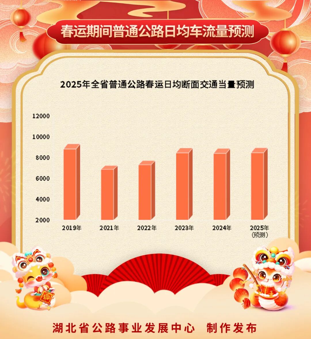 湖北省公路事业发展中心根据历年来春运车流规律分析,预判2025年春运期间高速公路日均通行车流量较2023年春运同期增长4.5%-8%,较2024年春运同期增长约7%左右,约为平日流量1.45-1.5倍,自驾出行占比达90%。