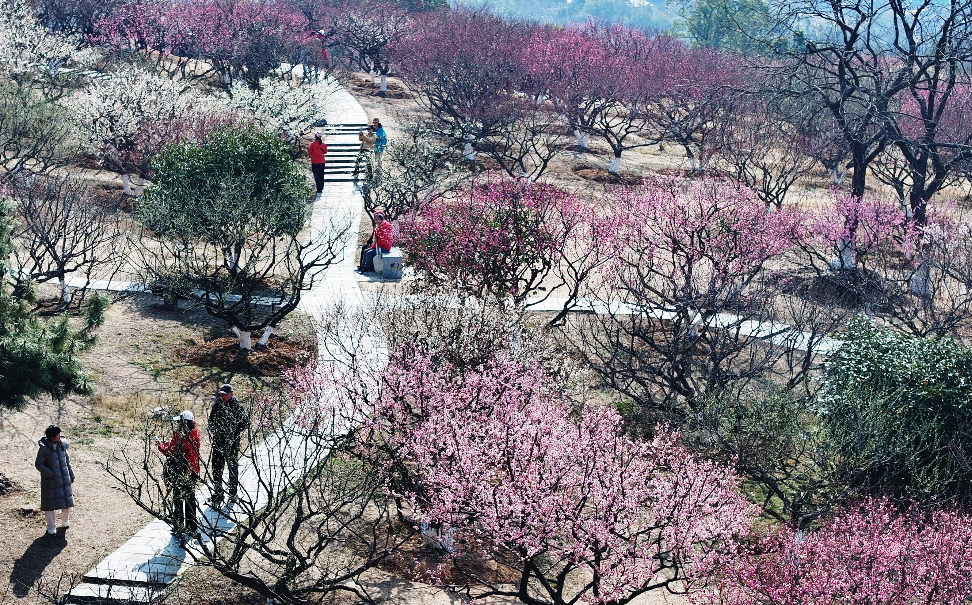 据介绍,马鞍山森林公园梅山上栽植梅树共1300多棵,包含宫粉类、玉蝶类、朱砂类等20多个梅花品种,目前已逐步进入盛花期。