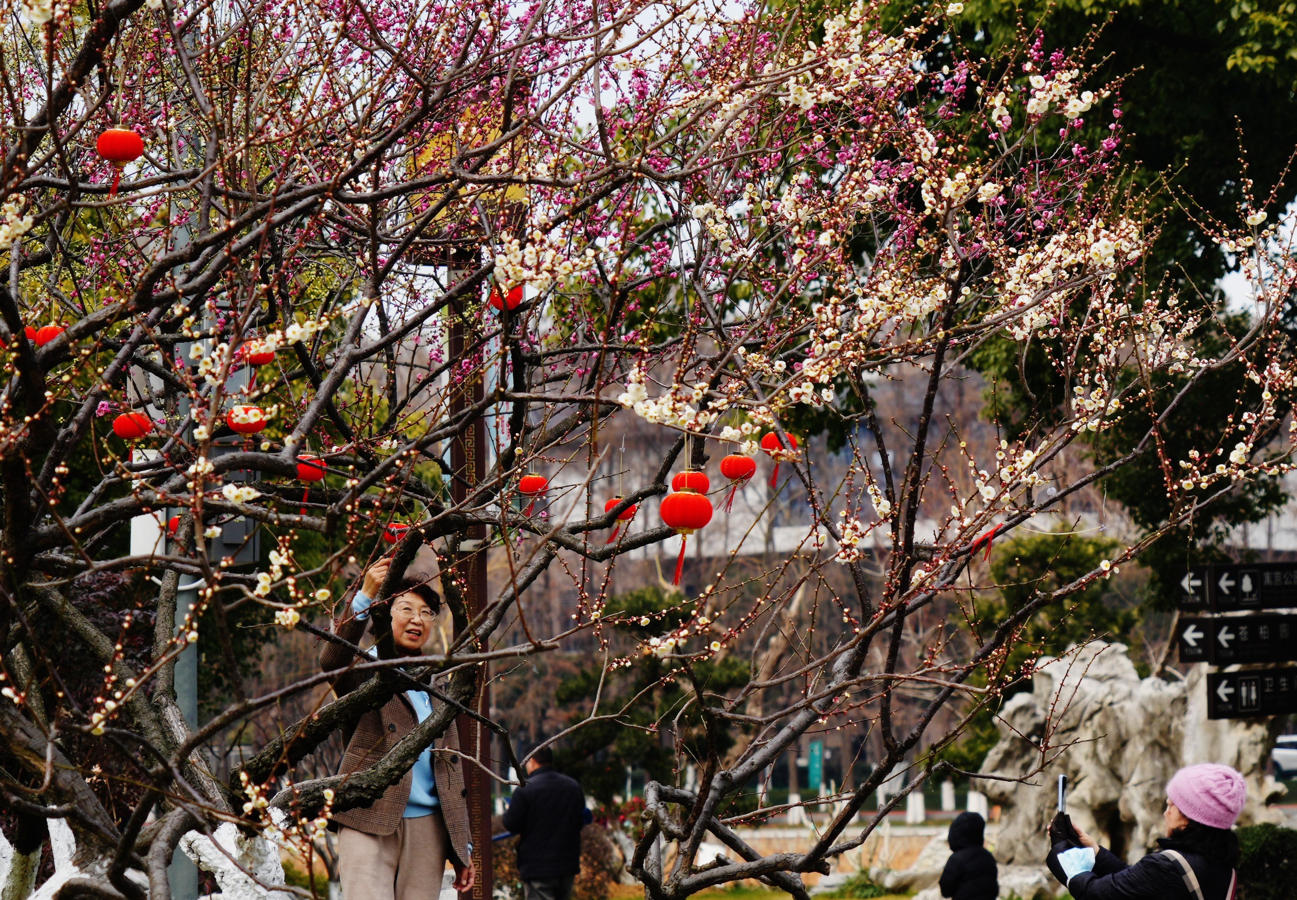 随后,长江日报记者抵达位于东湖听涛景区的小梅岭,刚靠近便觉此地散发着一种清幽雅致的韵味。小梅岭临湖而栖,白梅、粉梅错落有致地分布在山坡上,花蕊金黄点点,花枝上挂着一个个红灯笼,春节氛围浓郁。