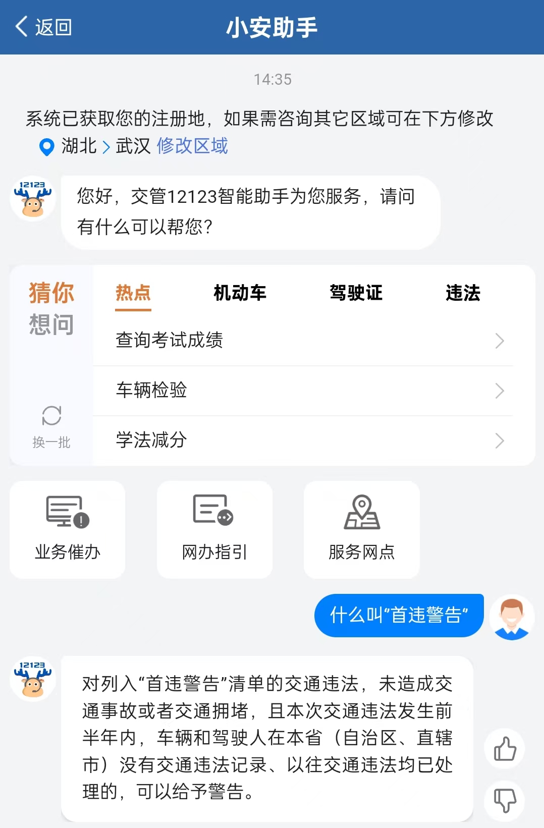 “交管12123”APP内“小安助手”对首违警告的回复。