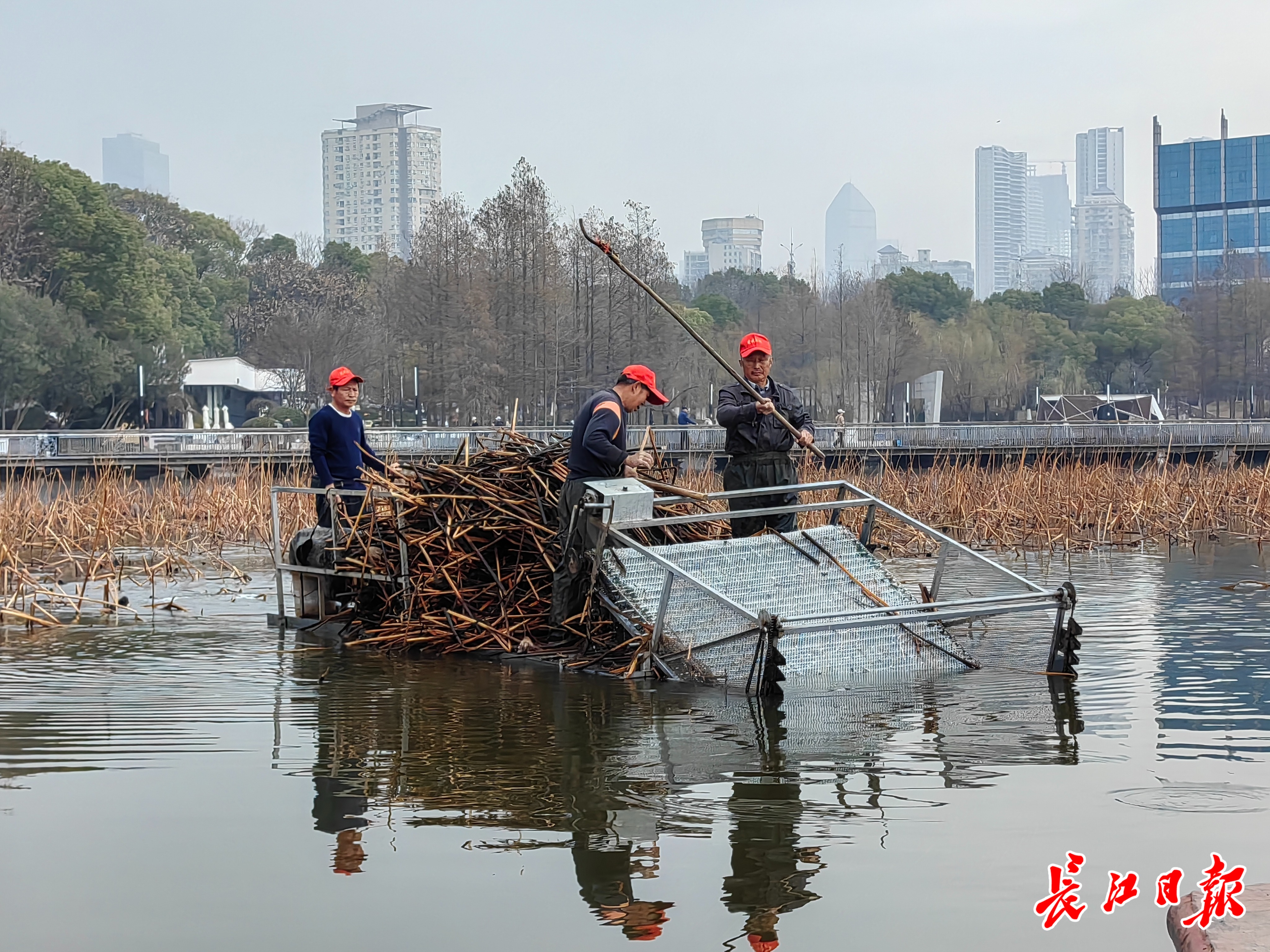 民间河湖长与公园工作人员合作清除残存荷梗。长江日报记者金文兵 摄