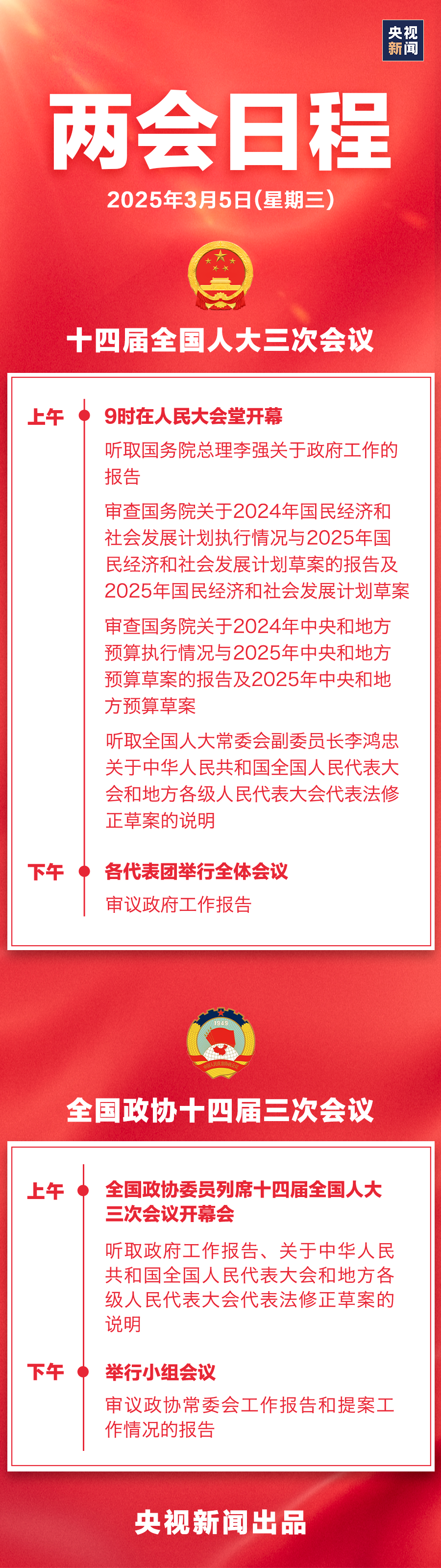 十四届全国人大三次会议5日上午9时在人民大会堂开幕,听取国务院总理李强关于政府工作的报告,审查国务院关于2024年国民经济和社会发展计划执行情况与2025年国民经济和社会发展计划草案的报告及2025年国民经济和社会发展计划草案,审查国务院关于2024年中央和地方预算执行情况与2025年中央和地方预算草案的报告及2025年中央和地方预算草案,听取全国人大常委会副委员长李鸿忠关于中华人民共和国全国人民代表大会和地方各级人民代表大会代表法修正草案的说明。下午,各代表团举行全体会议,审议政府工作报告。