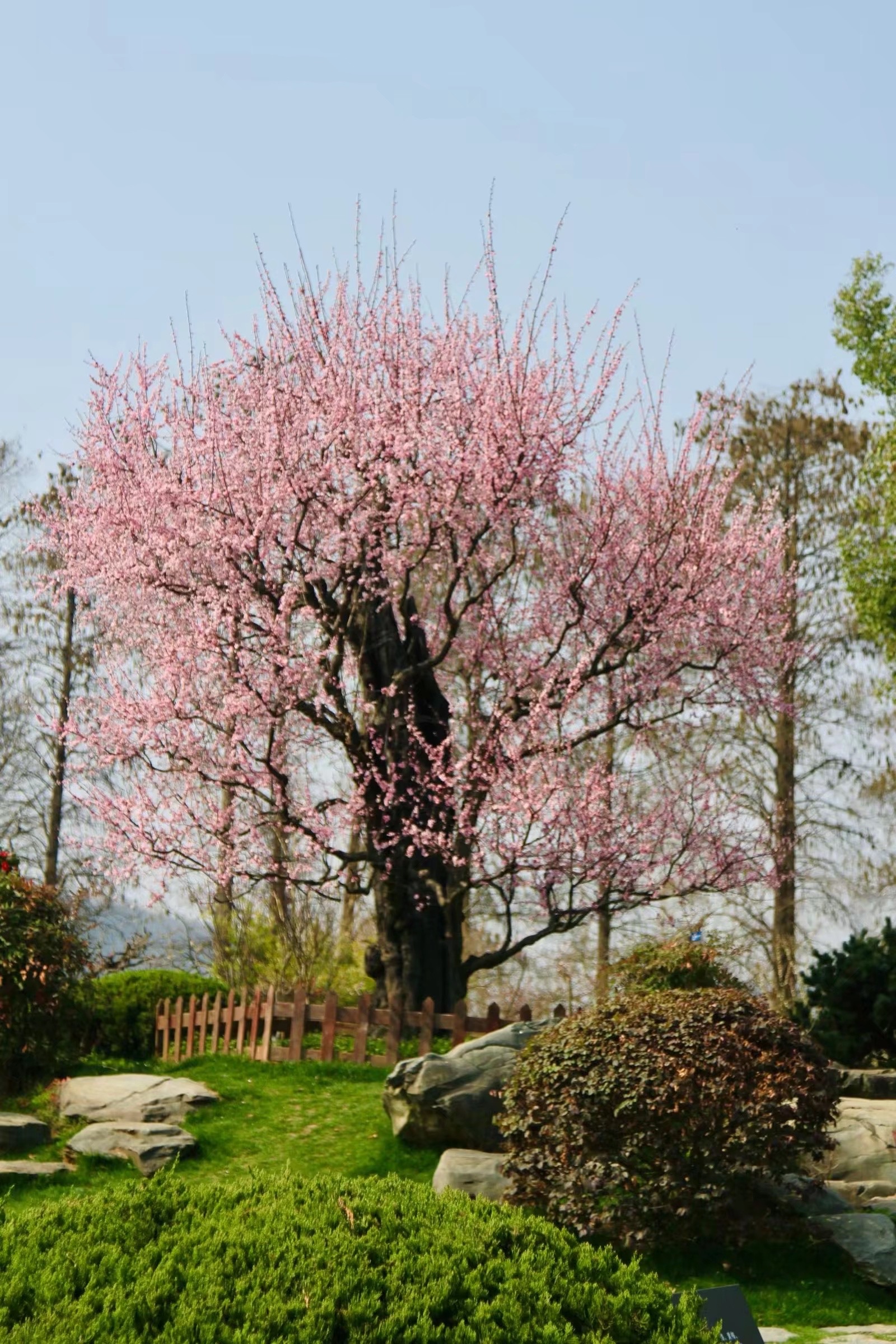 与此同时,东湖梅园的800余年树龄的镇园之宝美人梅——“国魂”也已盛开,携手一众晚花品种,正与东湖樱花园的早樱热烈相拥。