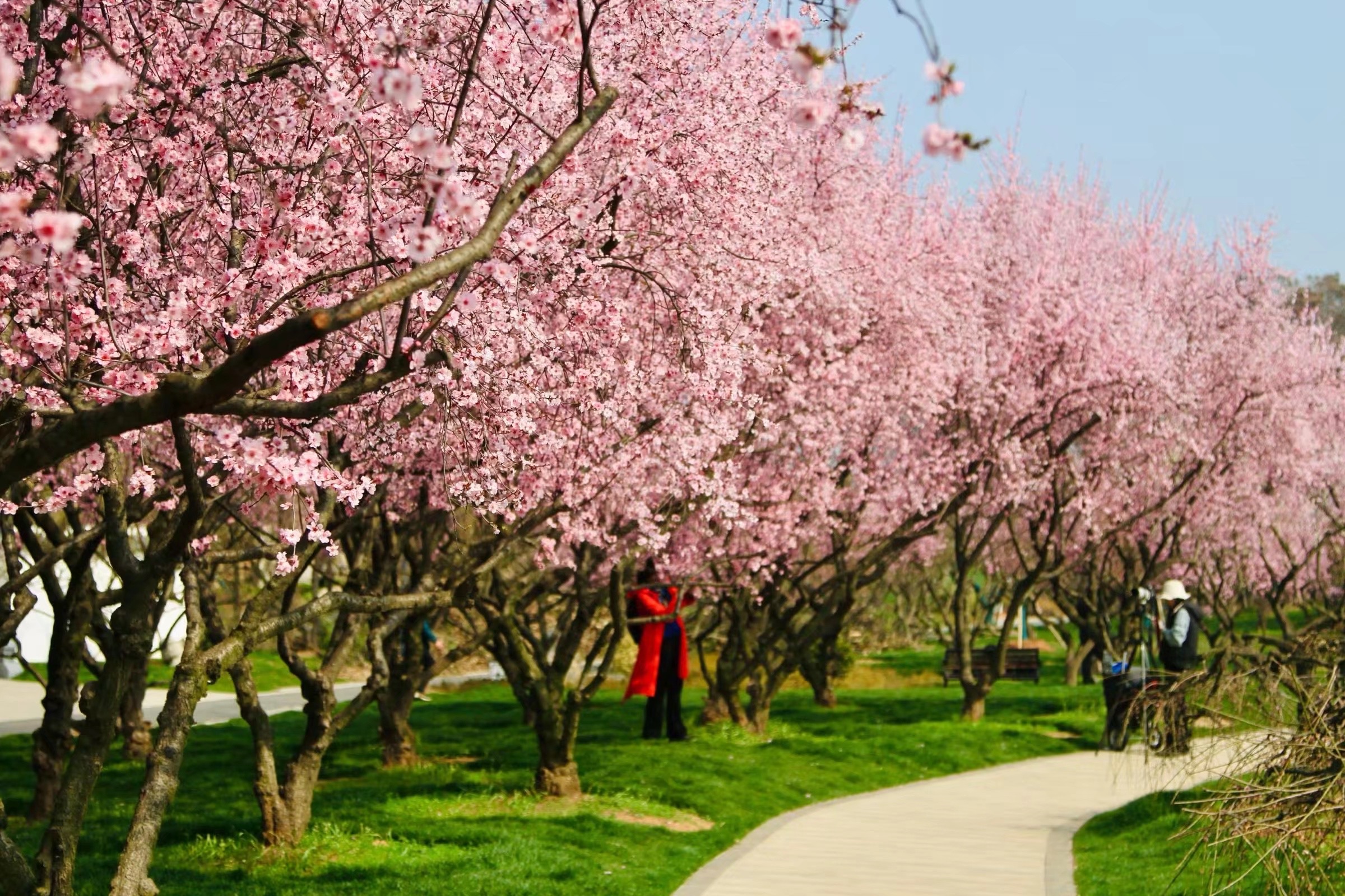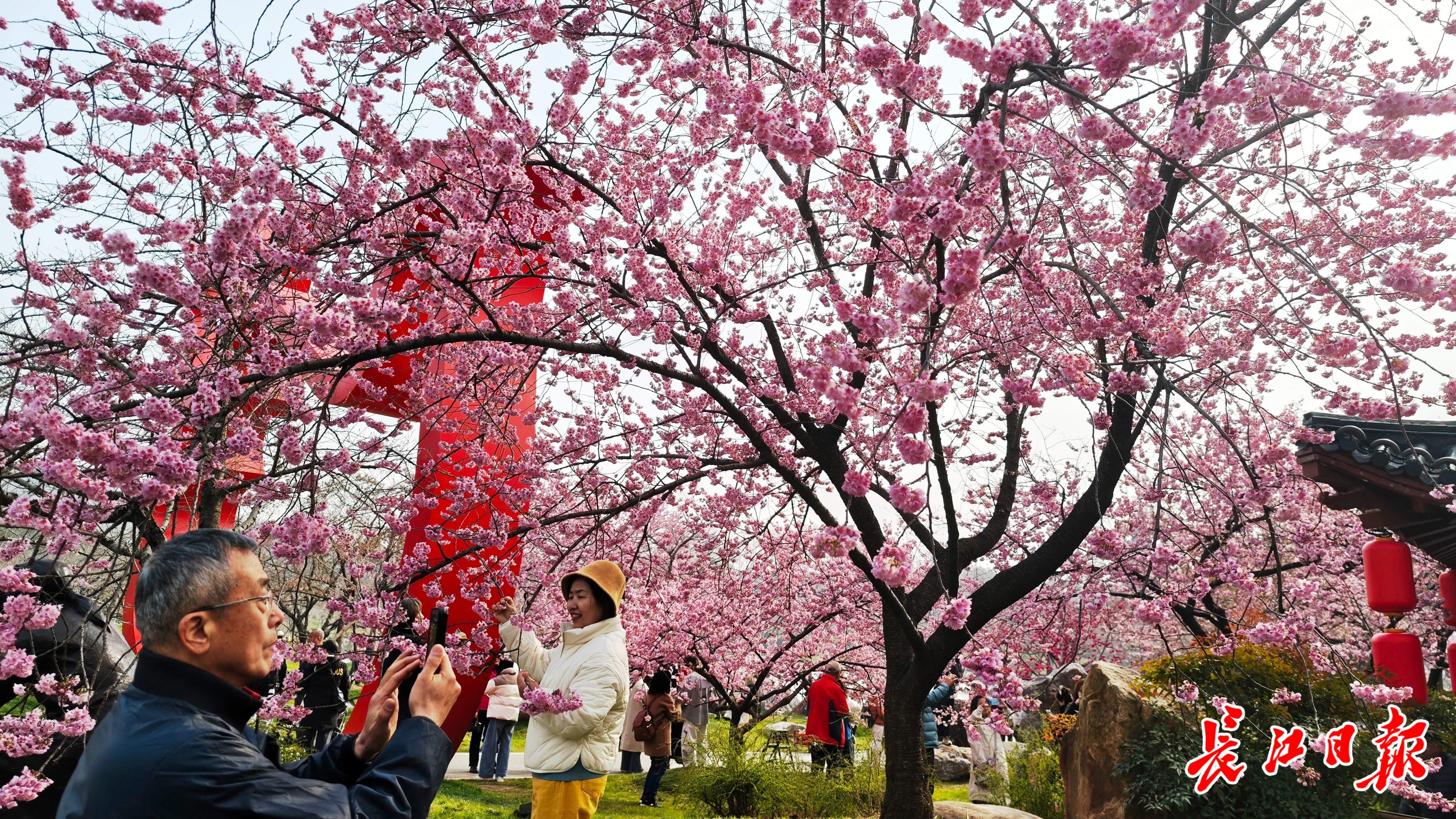 红粉相间的梅花与洁白如雪的樱花相互交织,为游客带来“梅樱同赏”一年一度的春日奇特景色。