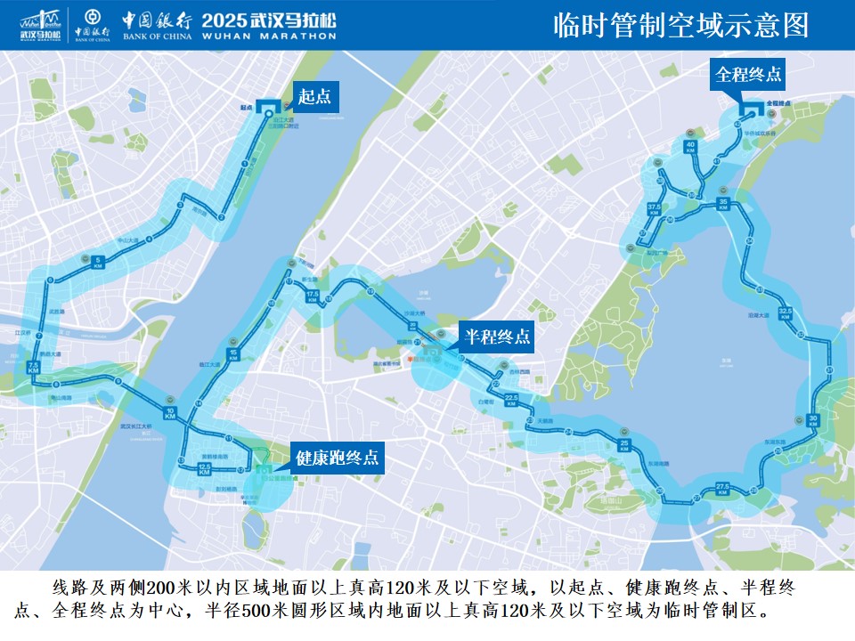 据悉,临时空域管制时间为:2025年3月23日0:00至14:00,区域为:2025年武汉马拉松跑道线路及两侧200米以内区域和以起点、三个终点(首义广场、松竹路、华侨城欢乐谷)为中心半径500米以内圆形区域真高120米及以下空域(详情见附图)。