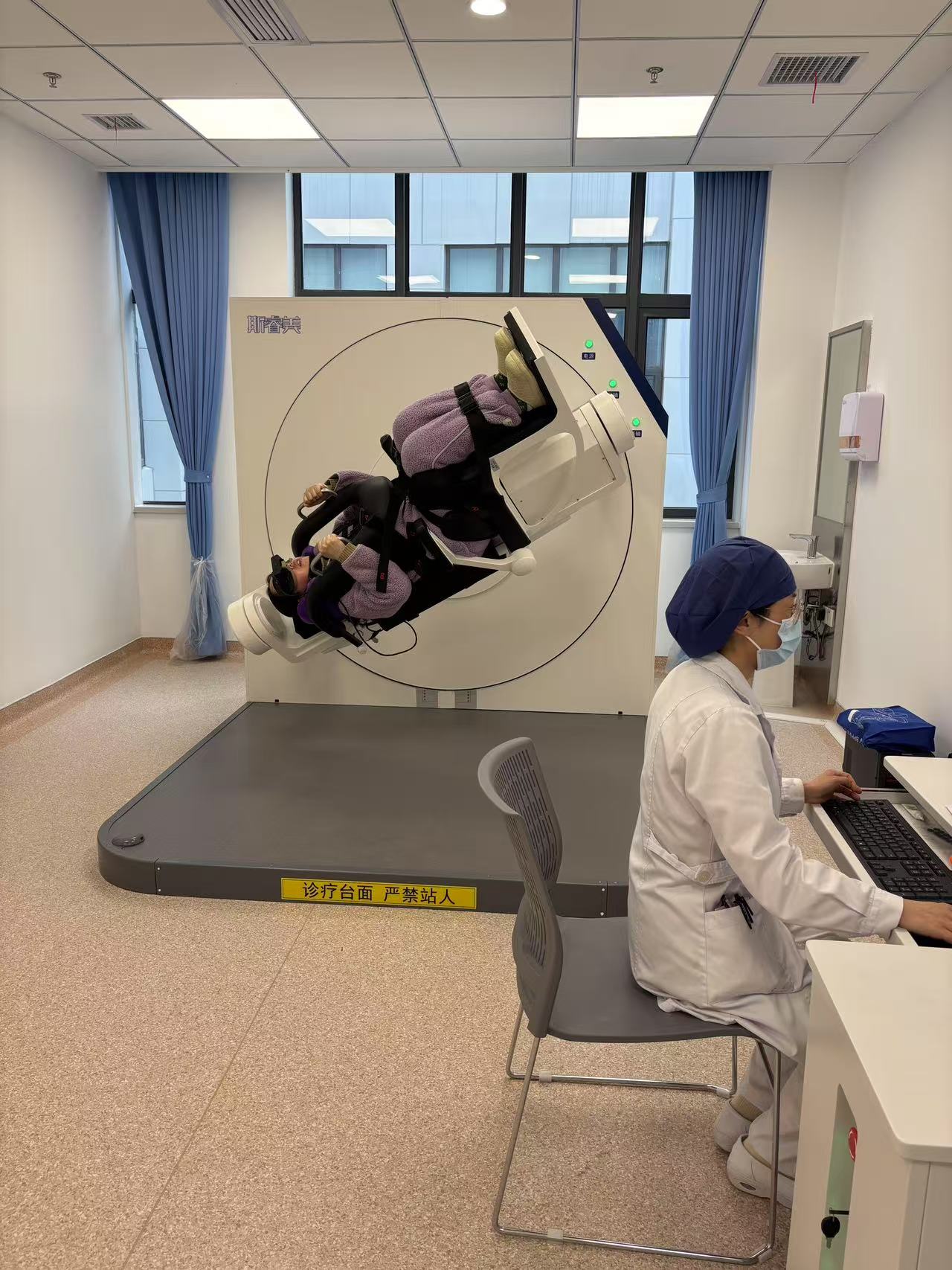 2日一早,沈先生在多方咨询后来到武汉大学人民医院洪山院区耳鼻咽喉—头颈外科杨明明副主任医师处就诊。通过一台全球领先的全自动耳石复位诊疗仪,医生为沈先生进行了高清视频眼震电图(VNG)监测。当他被安全固定于360°旋转椅进行Dix-Hallpike变位试验时,仪器内置的毫米级运动捕捉系统清晰记录到,其左耳水平半规管特征性眼震——这正是“嵴帽结石症”的典型信号。
