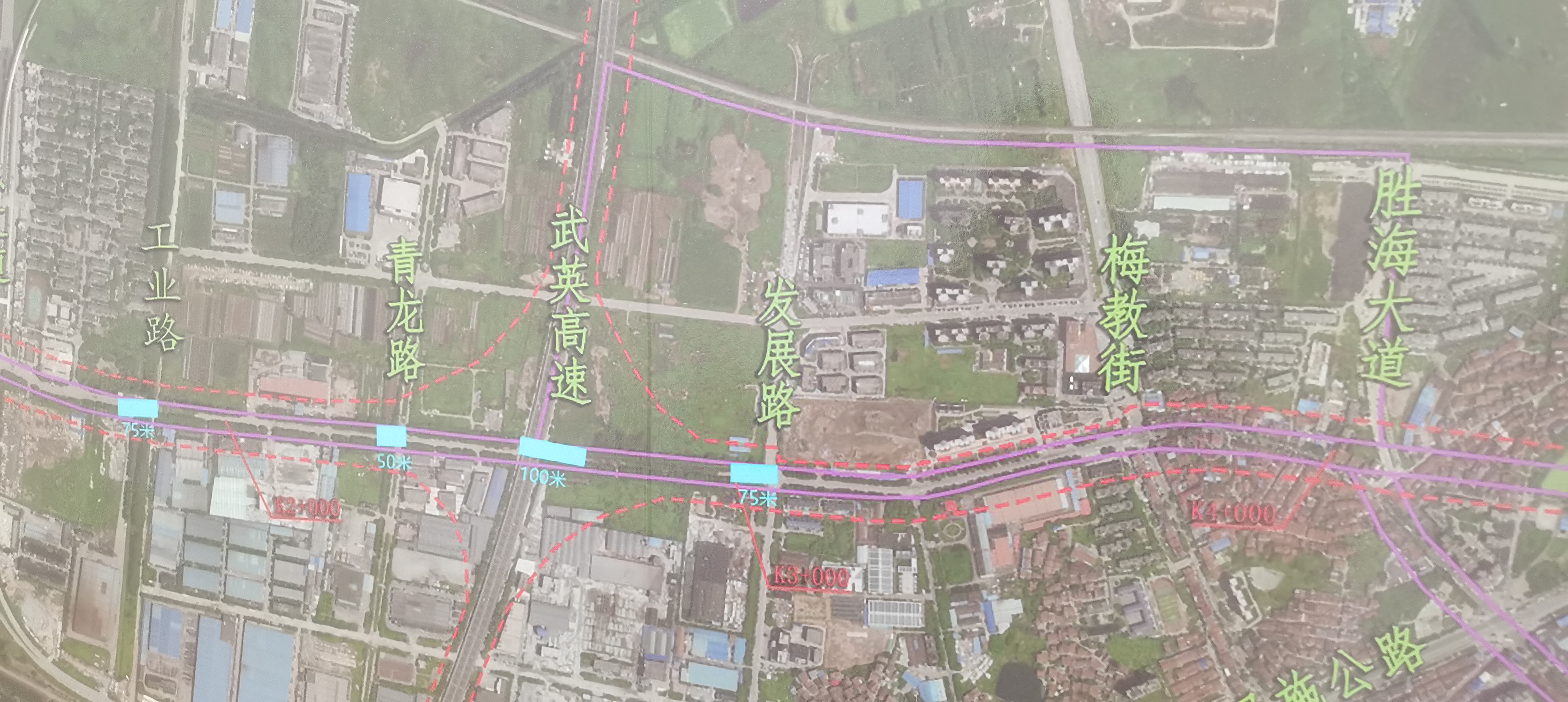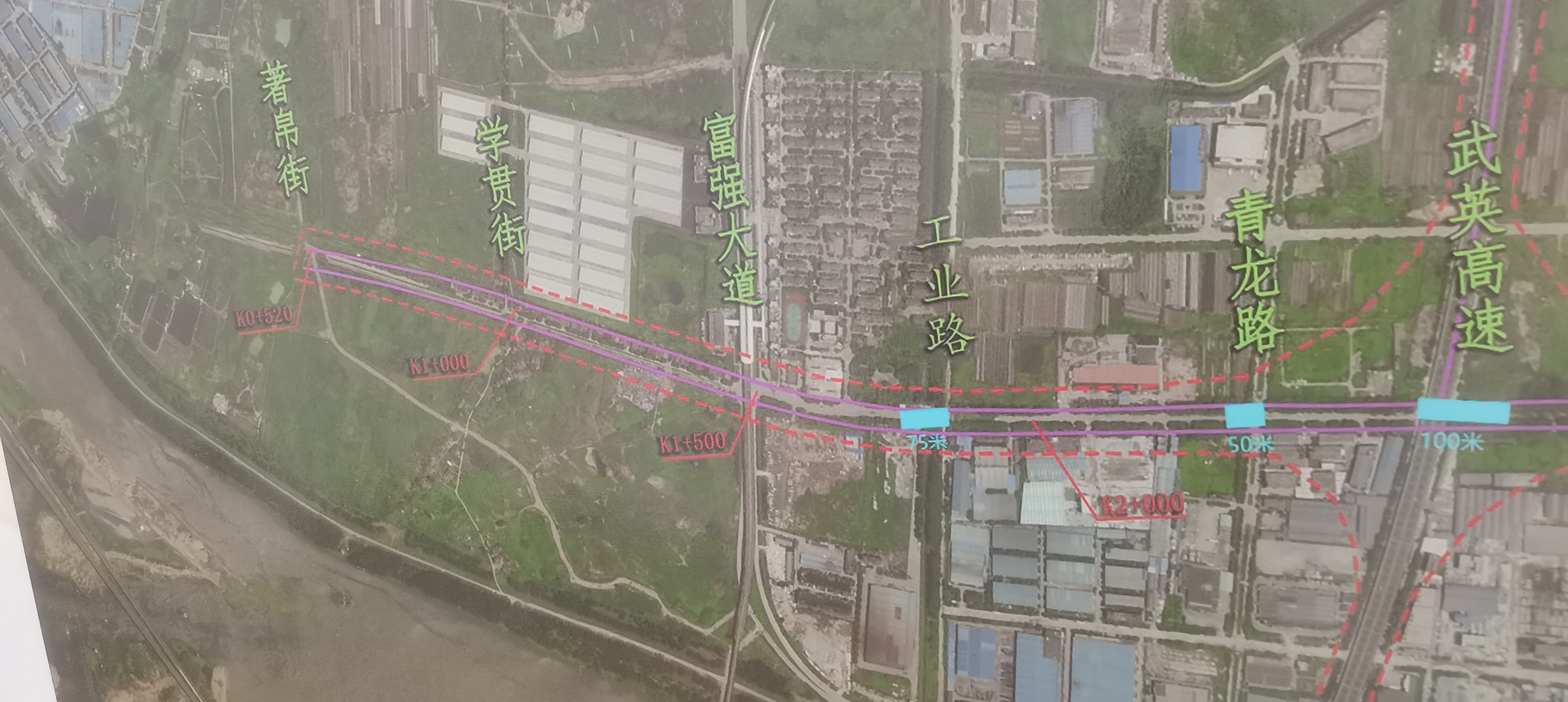 目前正在施工的是江湾大道一期,富强大道至梅教街,全长2.2公里。首段通车的梅教街至发展路,长约600米,是武湖街道中心路段。