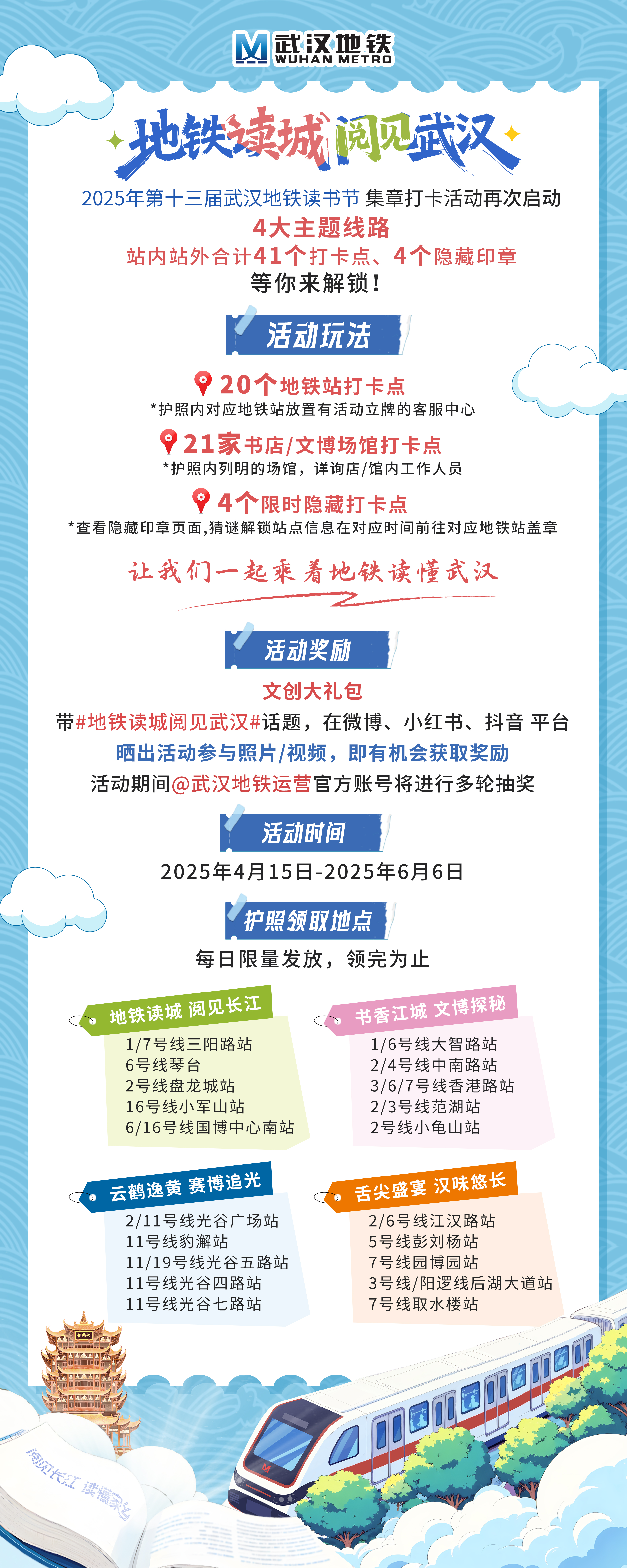 据介绍,本届地铁读书节集章打卡活动从4月15日至6月6日,以20个地铁站为圆心,向外辐射至20余家武汉市知名文博场馆、文旅地标、图书馆、书店等站外打卡点,以“阅见长江、文博探秘、赛博追光、汉味悠长”四大主题路线进行串联,倡导市民乘客在集盖印章的过程中领略“大江大湖大武汉”的豪迈情怀。