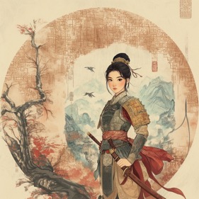 意大利设计师Agustin Scalisi则选择了中国古画柔和的色调,并添加雾山、樱花等细节,置身其中的花木兰栩栩如生。他对花木兰的故事进行了详细研究,将中国古代艺术与木兰故事融为一体,创作出既传统又清新的花木兰。