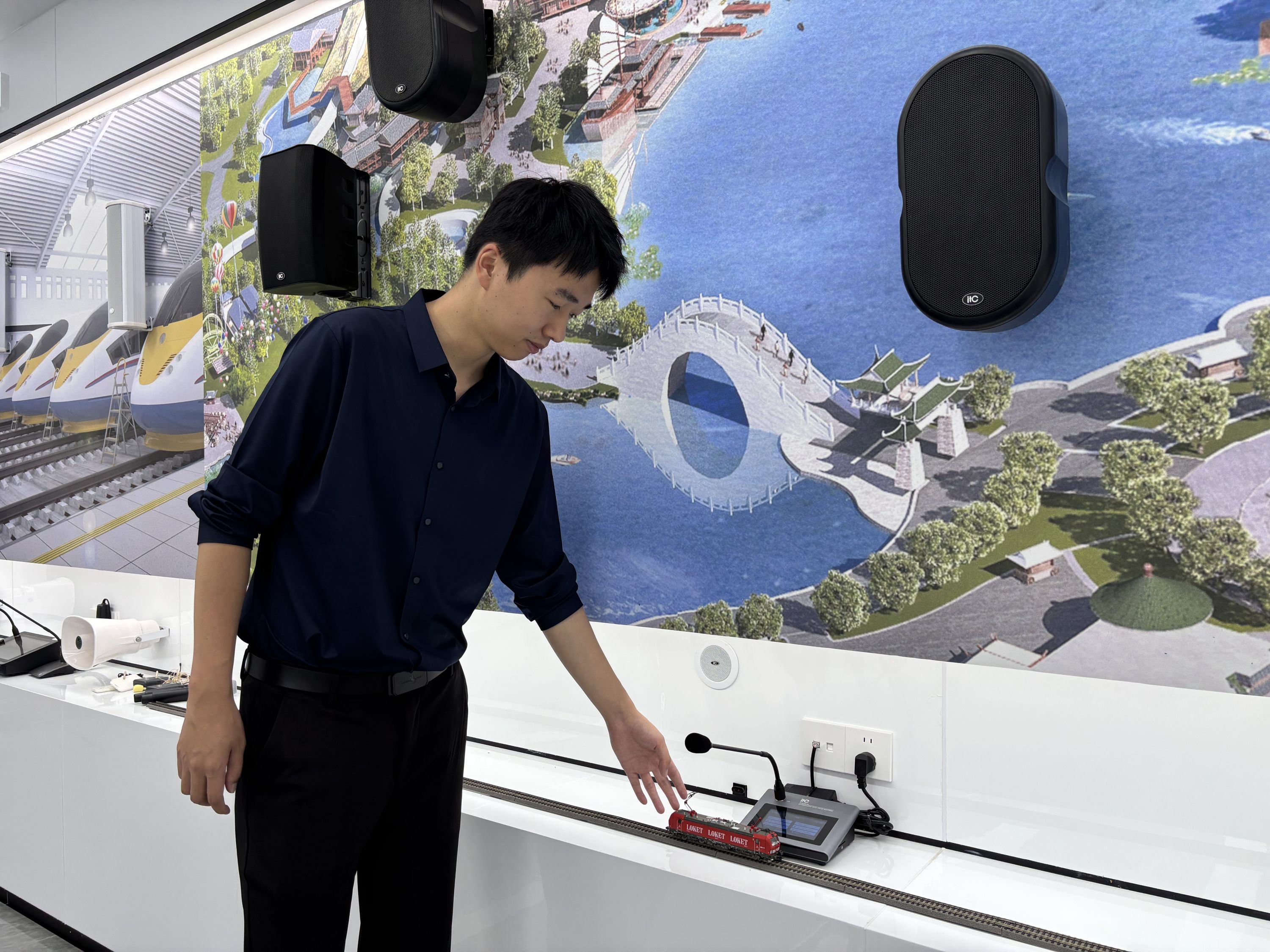保伦电子展厅里,景区应用场景下,巡游花车驶过打卡点,毫秒间就能触发道路旁音响设备自动播放背景音效。栾嘉雯摄
