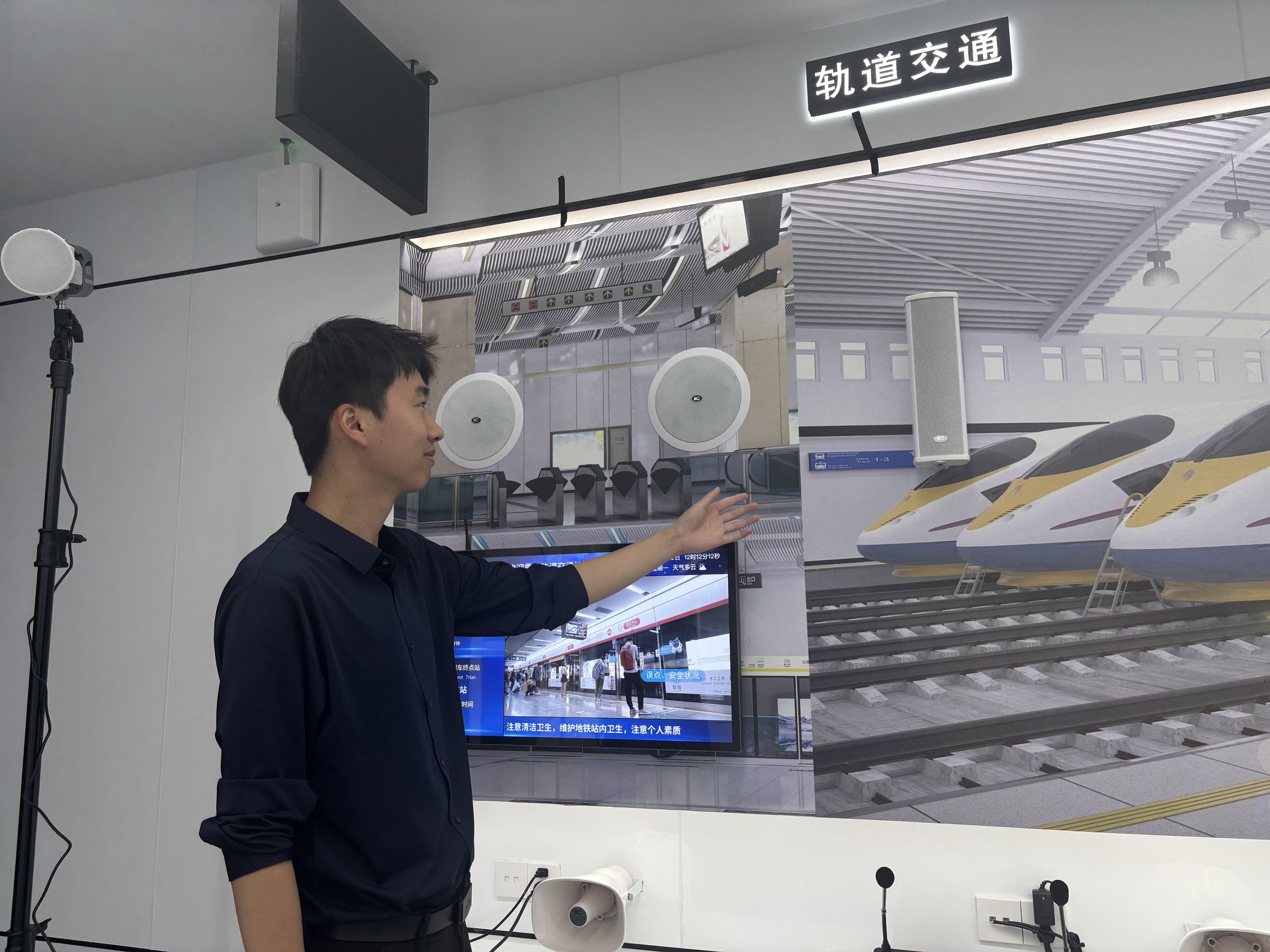 保伦电子展厅里,地铁隧道应用场景下,无需错综复杂的网线、电线布置,音响设备实现单向6公里的远距离传输。栾嘉雯摄