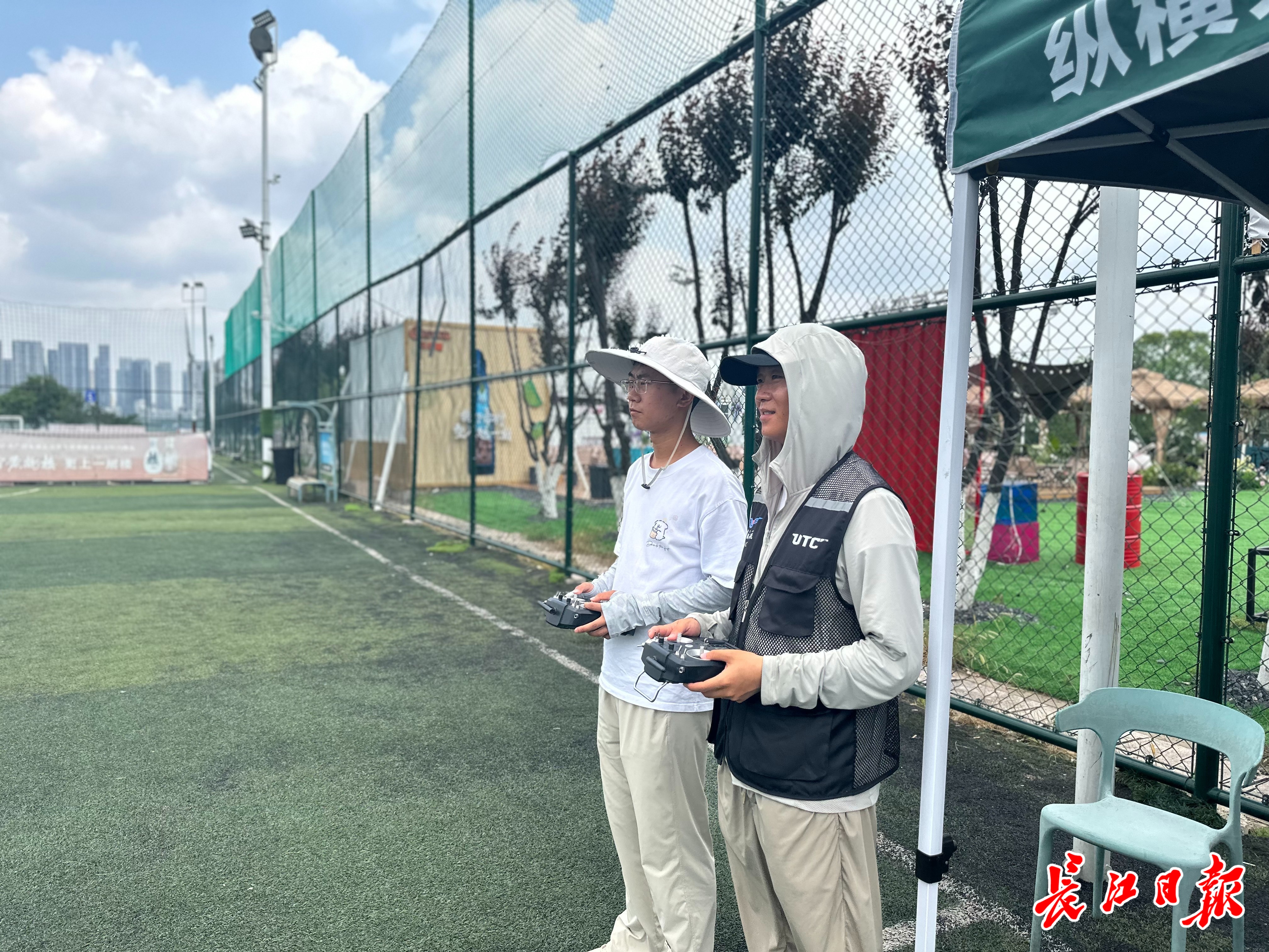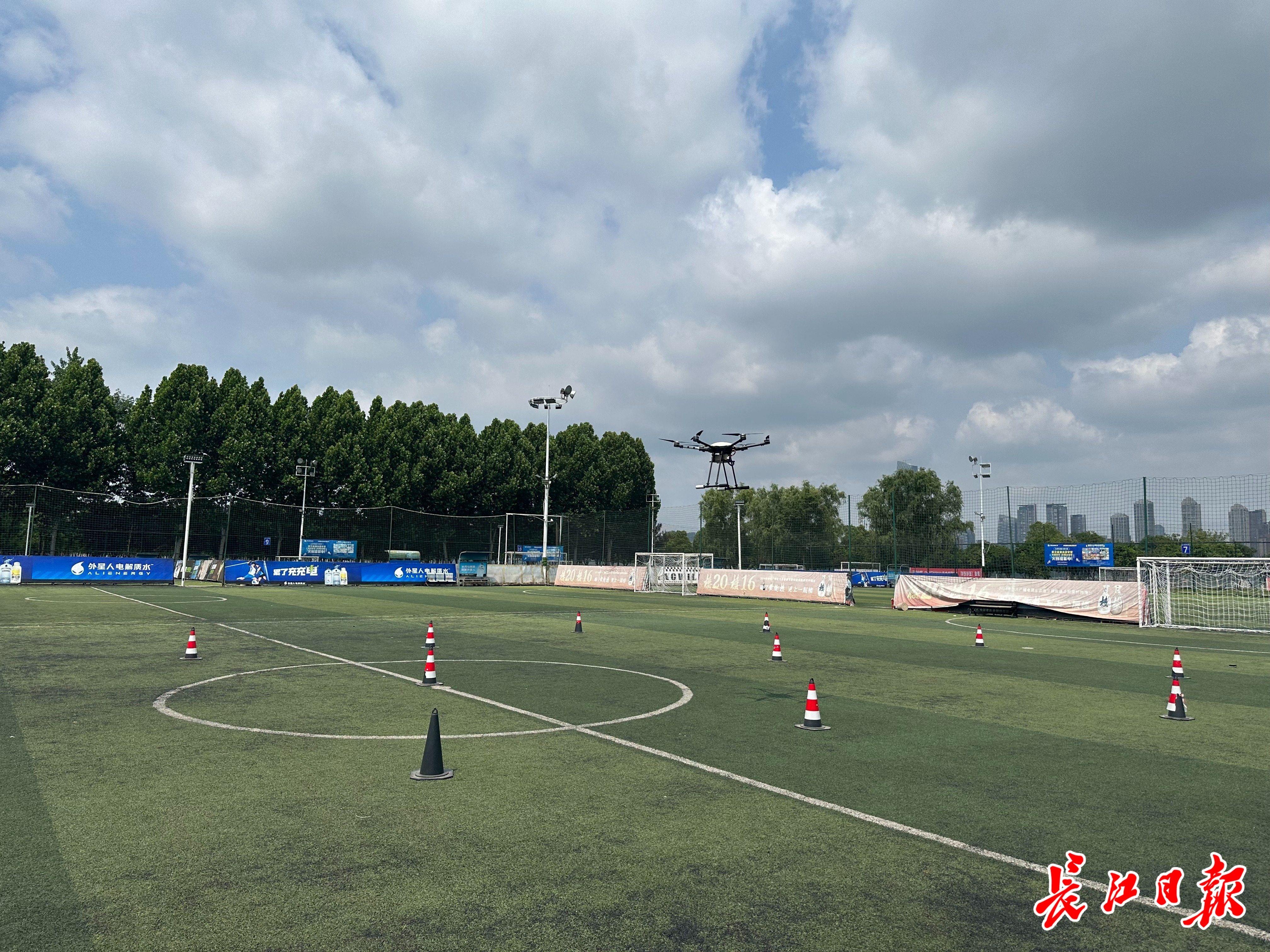 最近,武汉长江二桥下游的江滩足球场上,银灰色的无人机正随着指令在天空画出优美的“8”字轨迹。市民王先生带着小孙子驻足观看。这片占地3600平方米的草坪,原本是武昌区江滩五期捷众足球场,如今在白天被作为无人机实训基地使用。