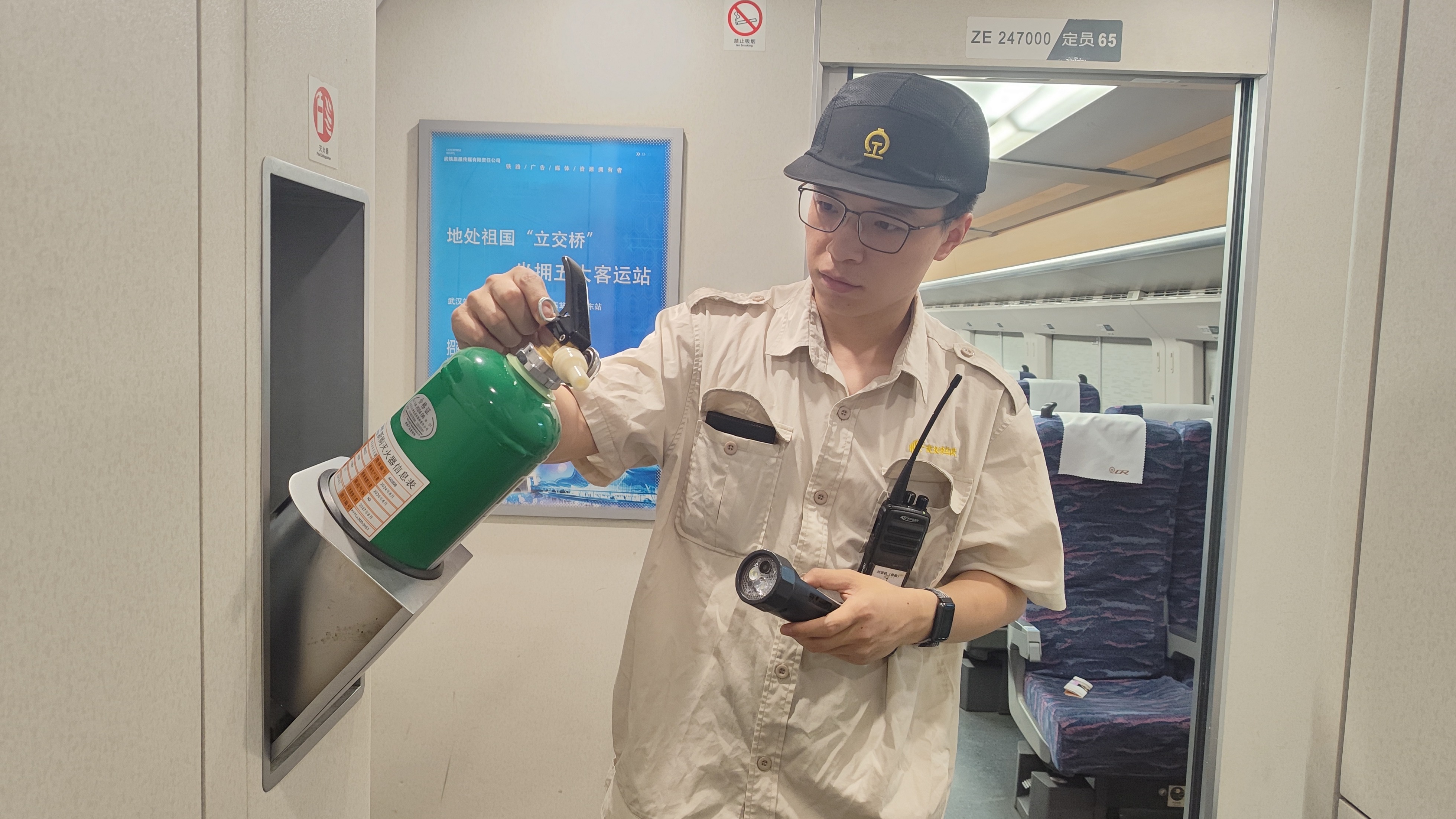 在检修库内,电机嗡鸣声与对讲机传出的指令声交织,28岁的动车质检员易广手持摄像手电,时而弯腰俯身,时而屈膝仰头,仔细检查着座椅、窗帘、影视照明、空调设备等客服设施状态。“质量复查的每一个项点都有严格的标准要求,我们的职责就是把好动车组出库前的‘最后一道防线’。”