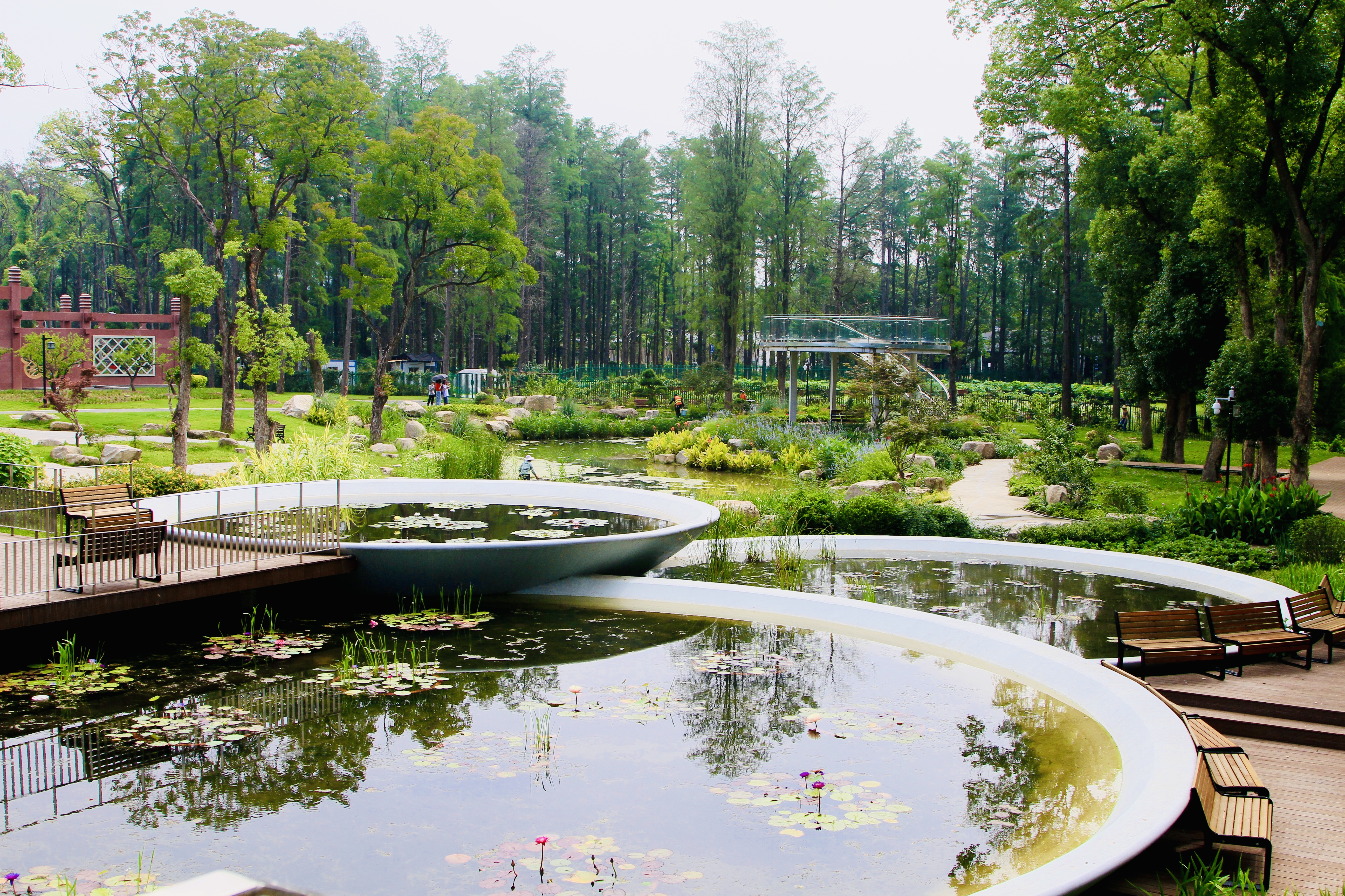 踏入园内,镌刻“中国荷花研究中心”字样的巨石古朴苍劲。沿着蜿蜒小径向前,“步步生莲”区域由5组共700个品种池构成,盛载满溢荷韵。移步至“荷园撷英”区,8个碗型种植池有序排列,睡莲、菖蒲、芦苇等水生植物高低错落,构建出层次丰富、生机盎然的景观。等王莲盛开后,5株王莲直径逾1.5米的巨型叶片将似天然翡翠玉盘漂浮水面,与睡莲相映成趣。
