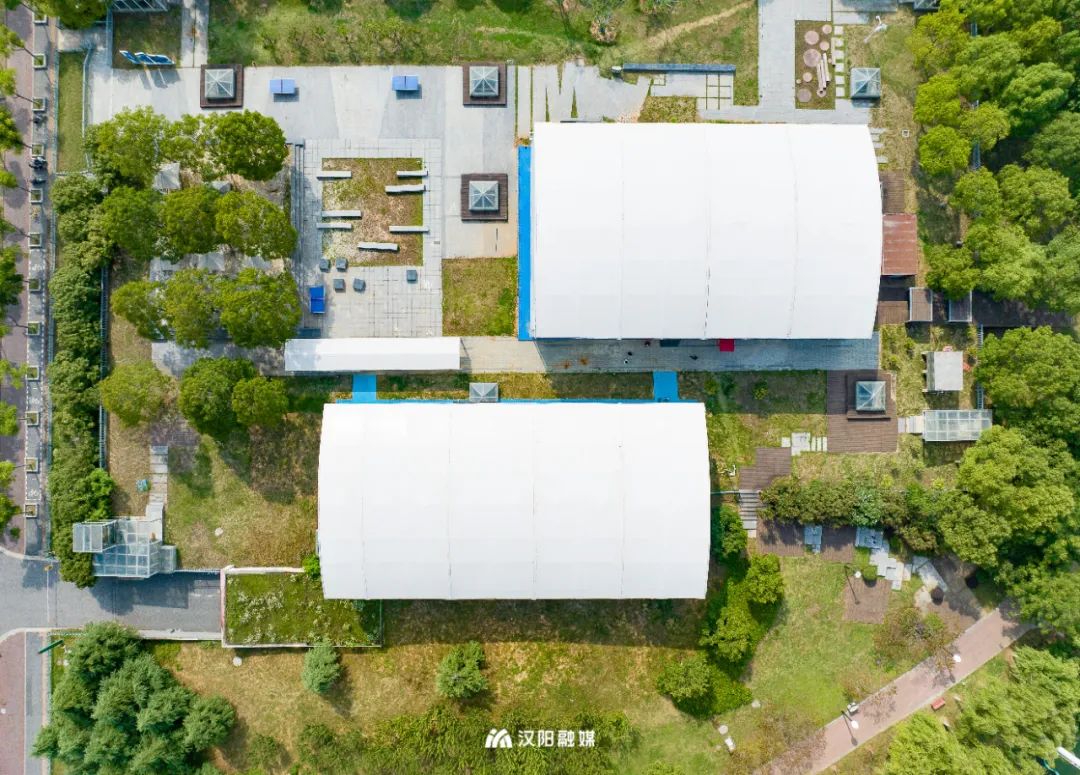 汉阳君在现场看到,从墨水湖南路入口沿着水杉步道进去后,一片规整开阔的缓坡草坪上,两座有着银白流线型顶棚的通透运动空间映入眼帘。