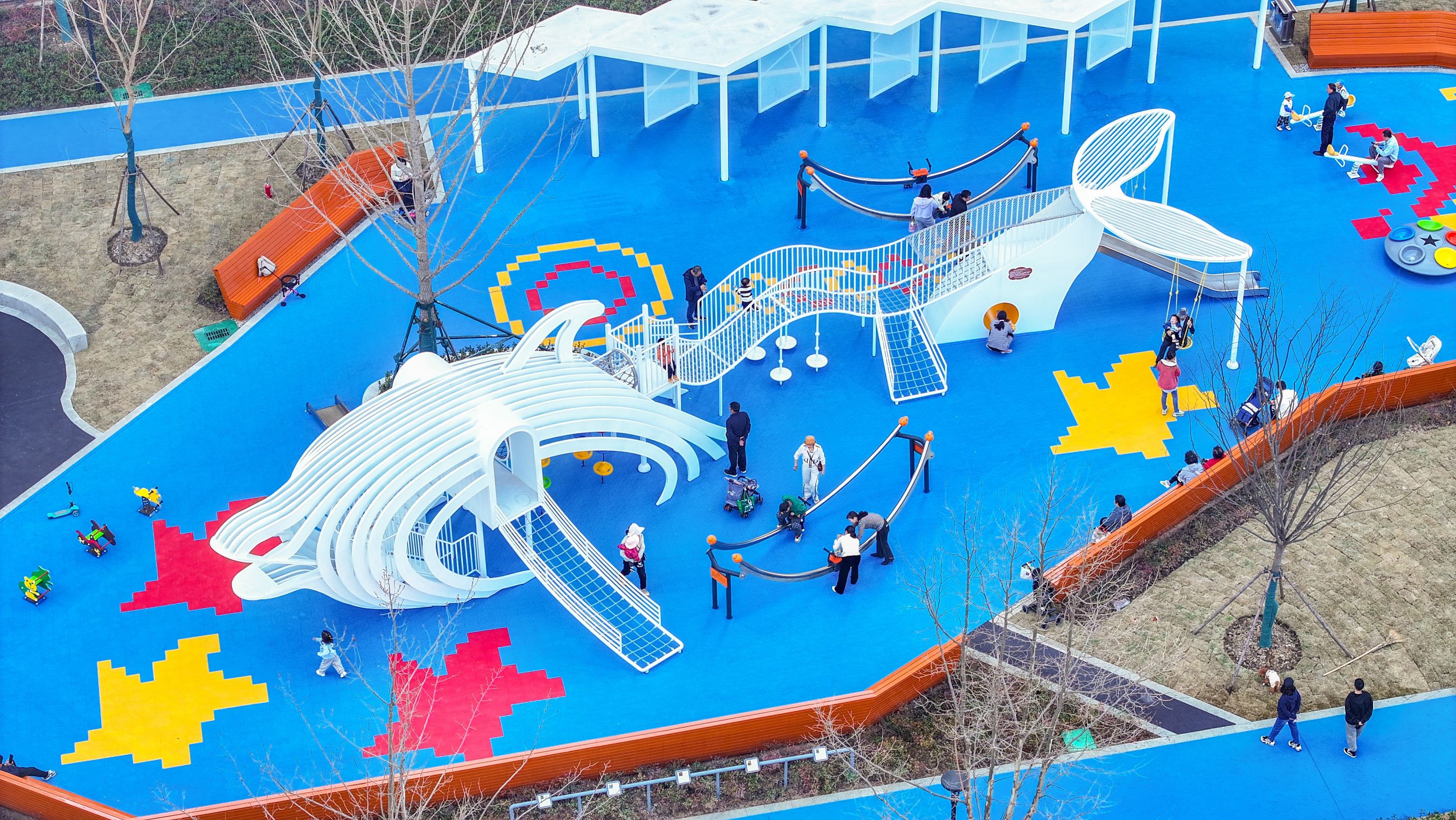 公园以海洋为设计主题,采用海浪、沙滩、鲸鱼等景观元素,色彩鲜艳、充满童趣。江汉区城管执法局(园林局)规划建设工作人员娄艺帆介绍,前期设计阶段广泛邀请孩子们贡献智慧,不少小朋友都提到了“海边”。“有个小女孩说,她最喜欢海底世界的神秘感,希望公园也能像寻宝一样充满惊喜,这个想法直接启发了我们的波浪形动线设计。”娄艺帆说。